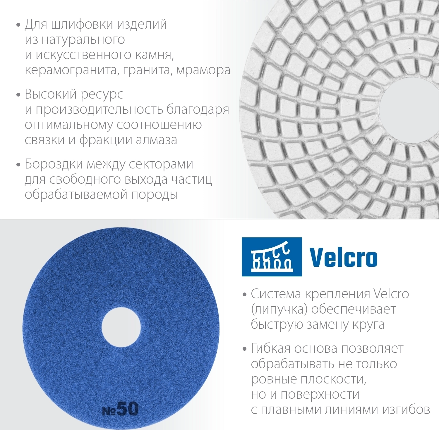 Для шлифовки и полировки изделий из натурального и искуственного камня, керамогранита, гранита, мрамора с применением водяного охлаждения. Используется на ручном электроинструменте (УШМ, полировальные машины, дрели) с насадкой адаптером под липучку Velcro.