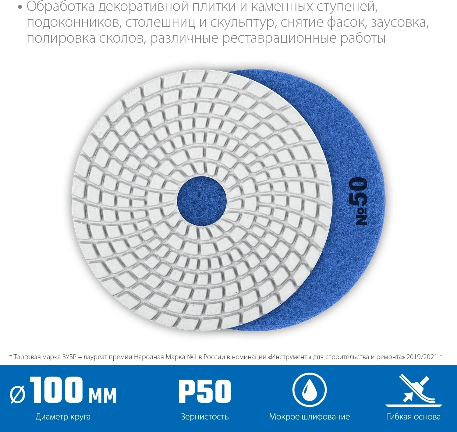 Алмазный шлифовальный круг ЗУБР 100 мм №50 мокрое шлифование гибкий