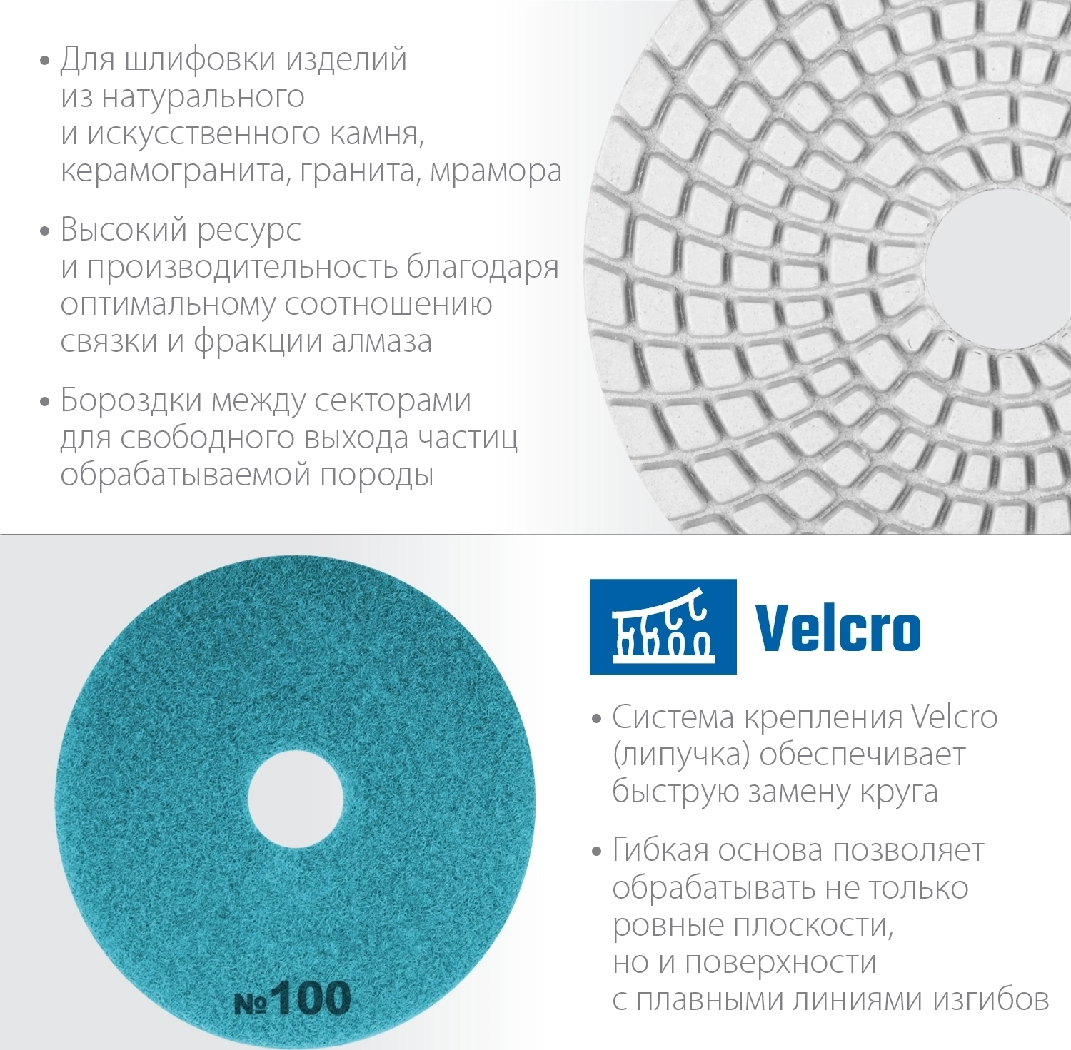 Для шлифовки и полировки изделий из натурального и искуственного камня, керамогранита, гранита, мрамора с применением водяного охлаждения. Используется на ручном электроинструменте (УШМ, полировальные машины, дрели) с насадкой адаптером под липучку Velcro.
