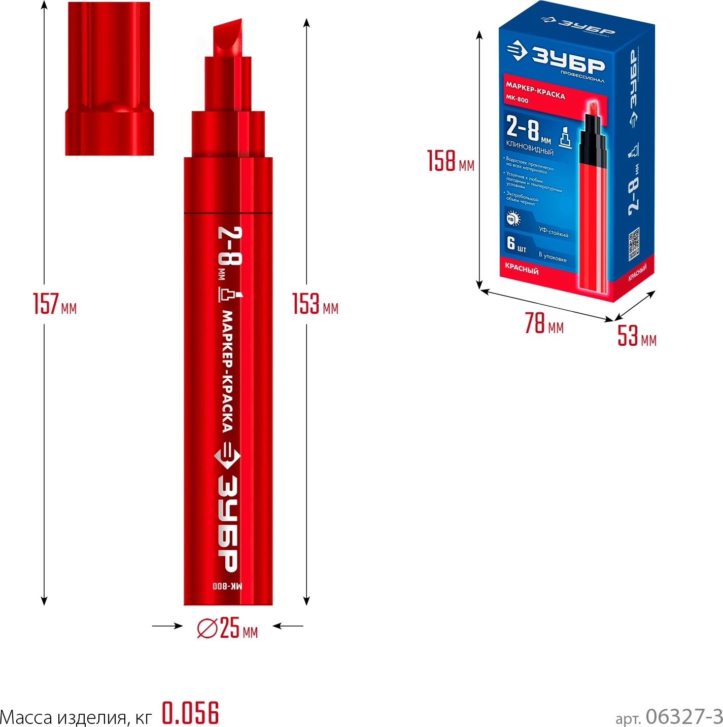 Маркер-краска клиновидный ЗУБР МК-800 2-8 мм, красный