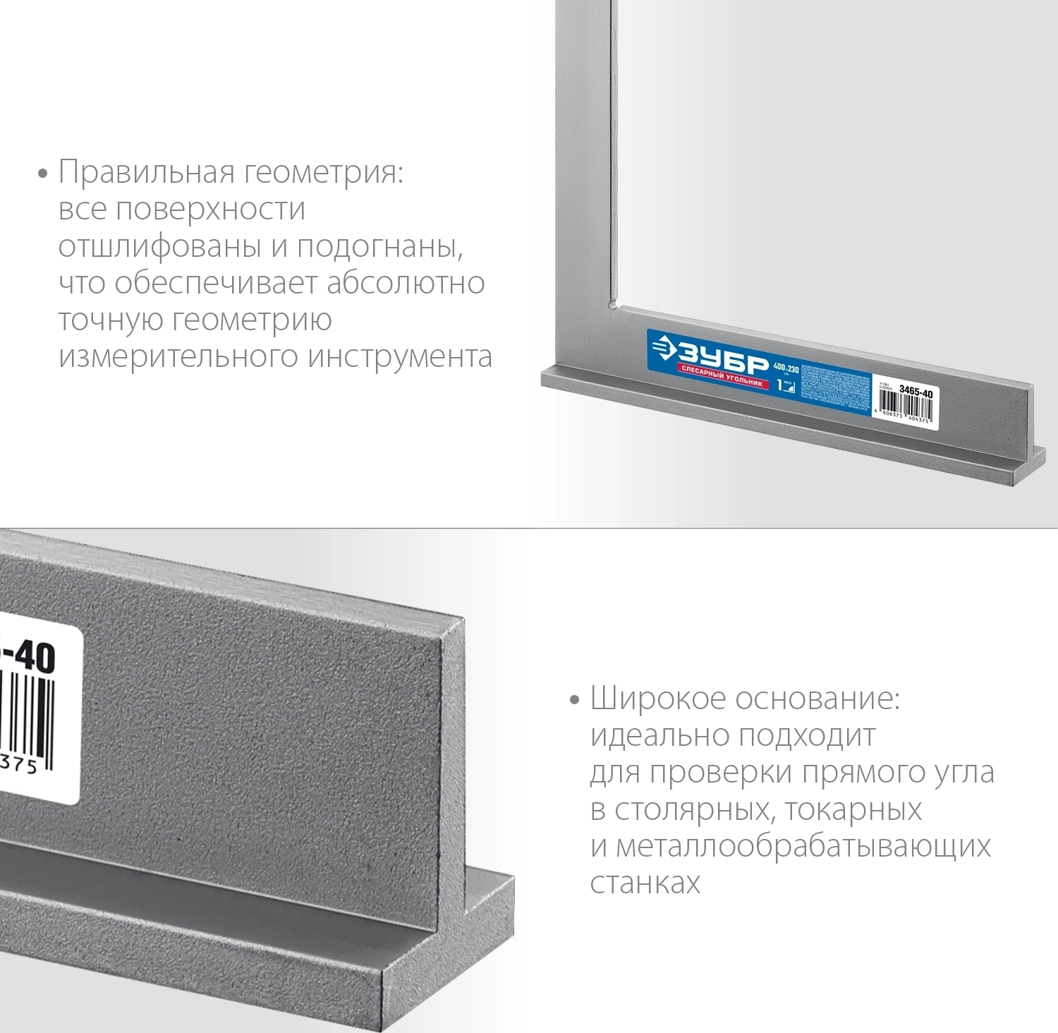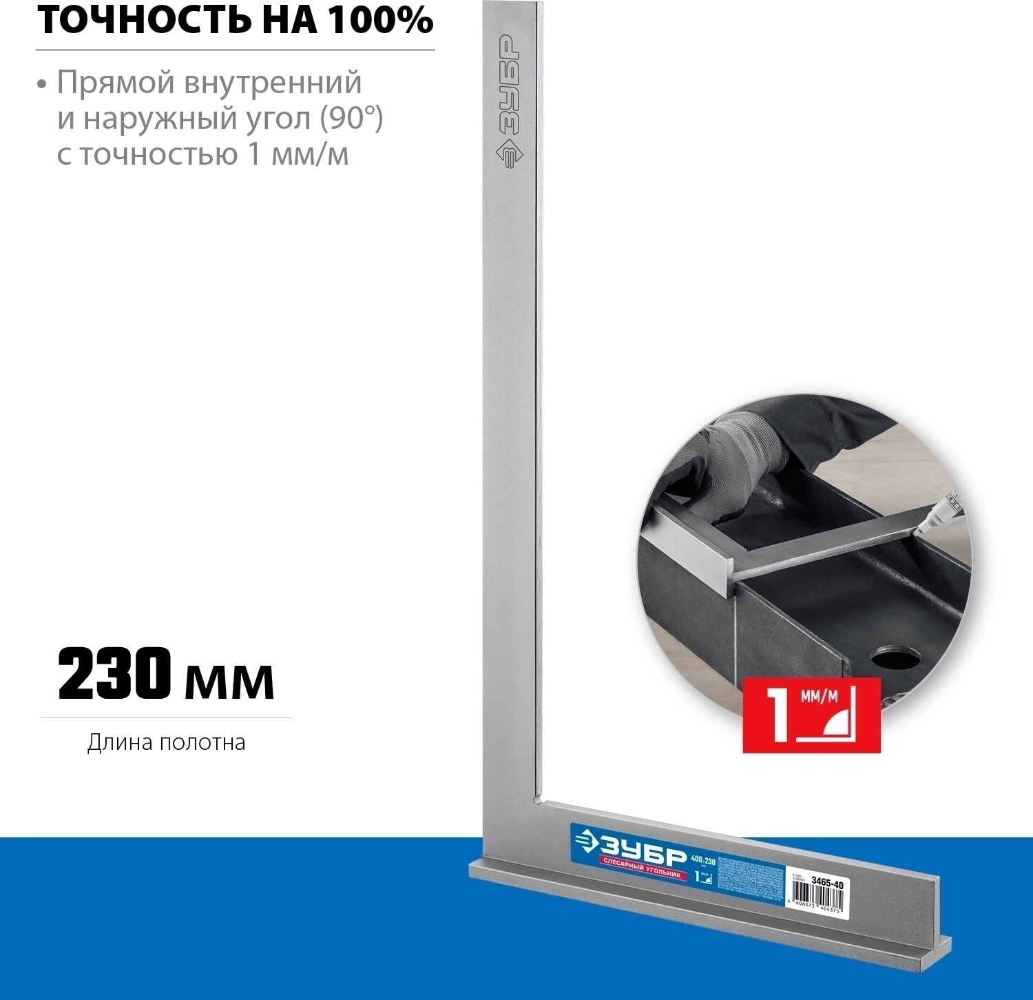 Мощный профессиональный цельнометаллический угольник со стальным полотном толщиной 5 мм и широким основанием.