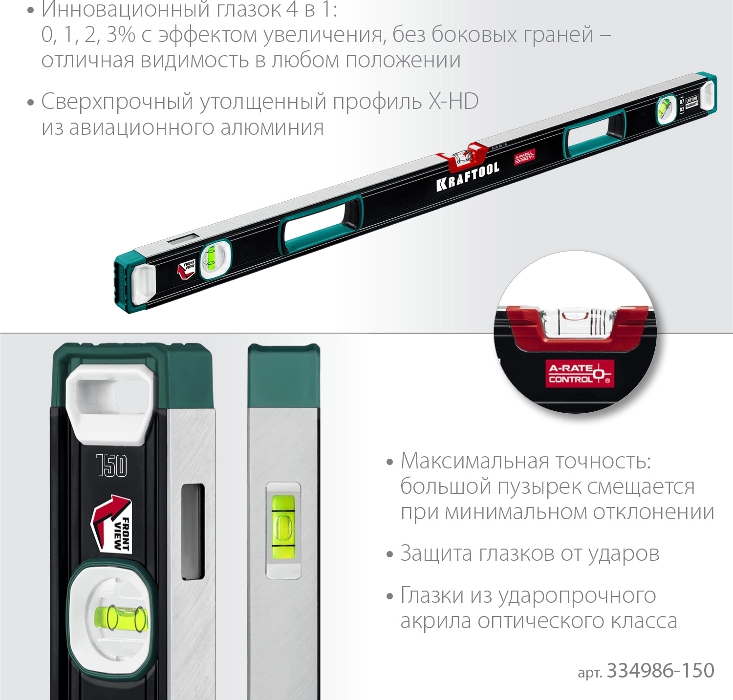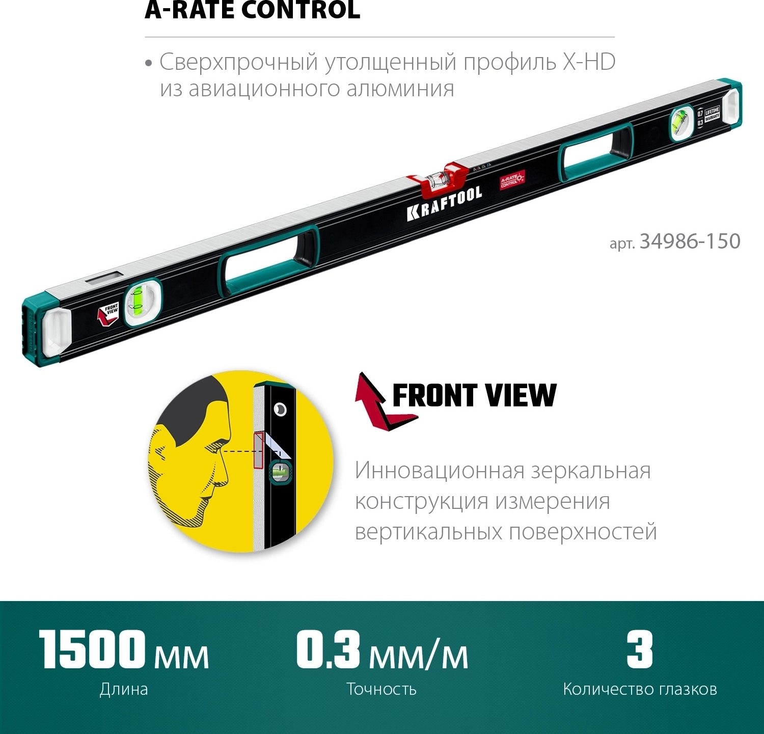 Сверхпрочный уровень KRAFTOOL A-RATE CONTROL, 1500 мм, точность 0.3 мм/м, с инновационным зеркальным глазком