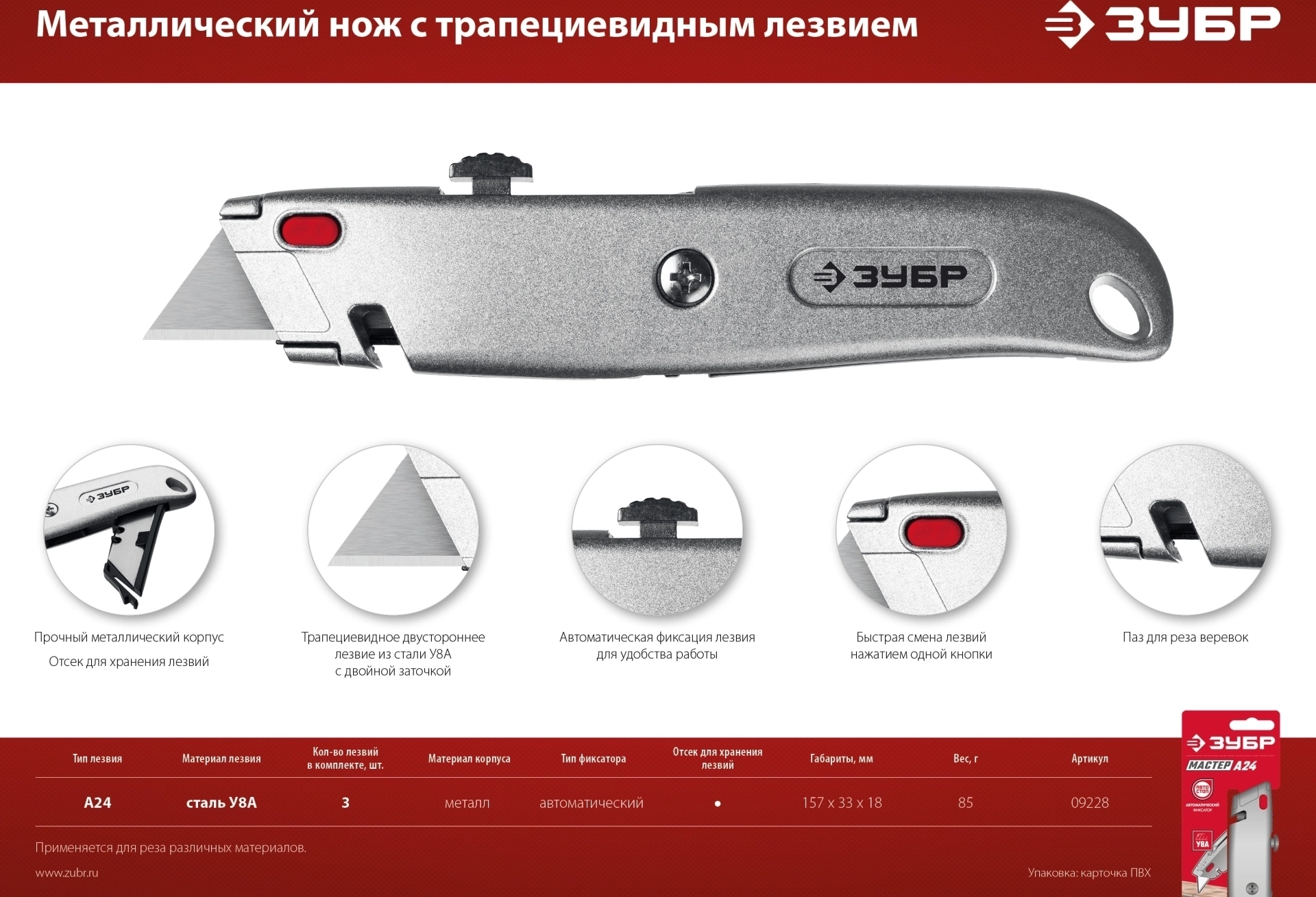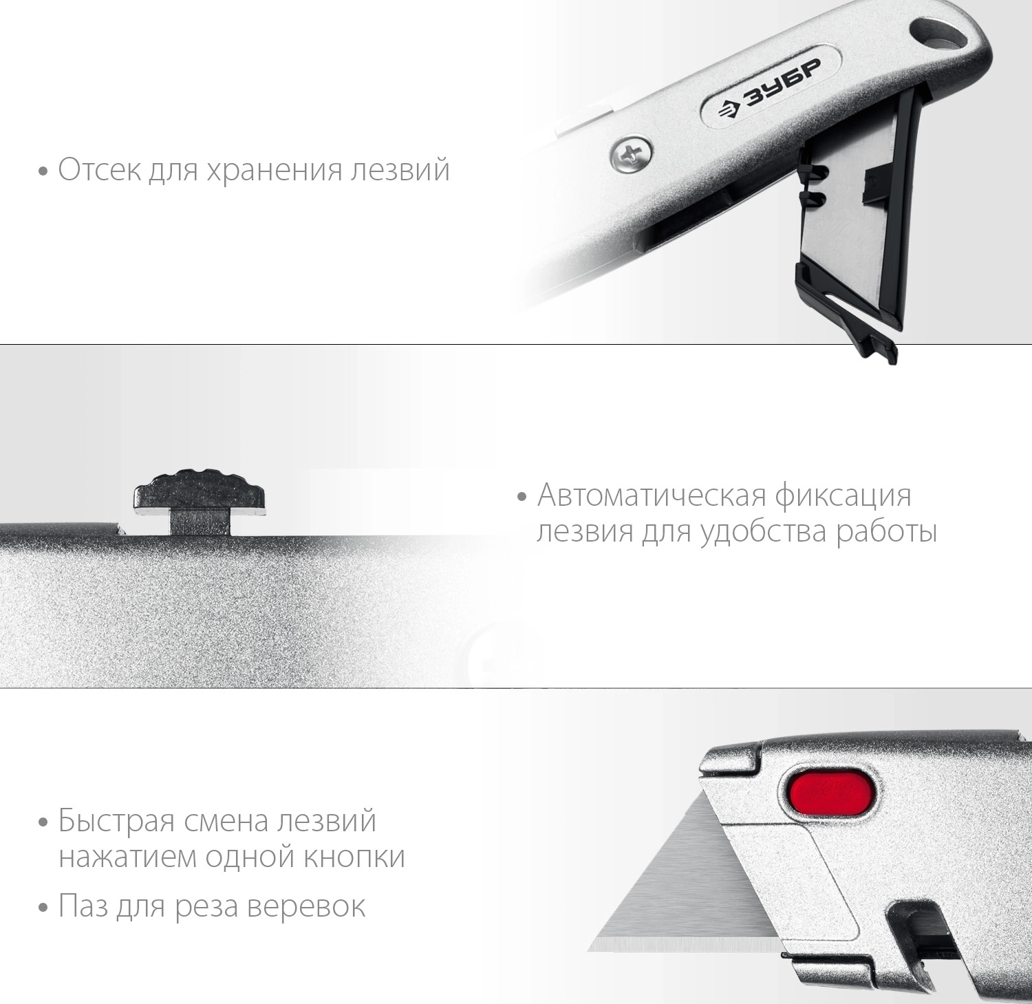 - Выдвижное лезвие с автоматической фиксацией для удобства работы