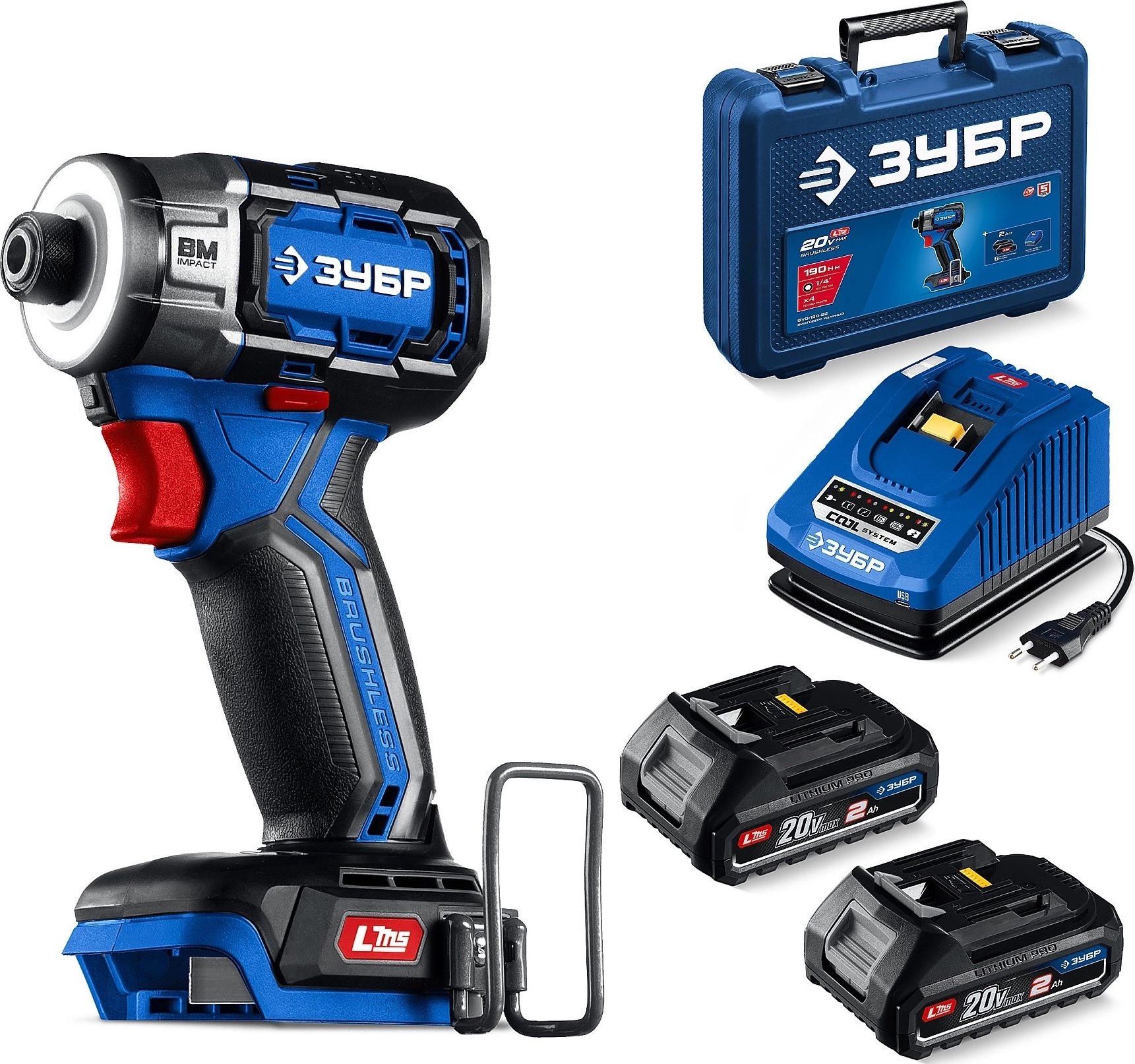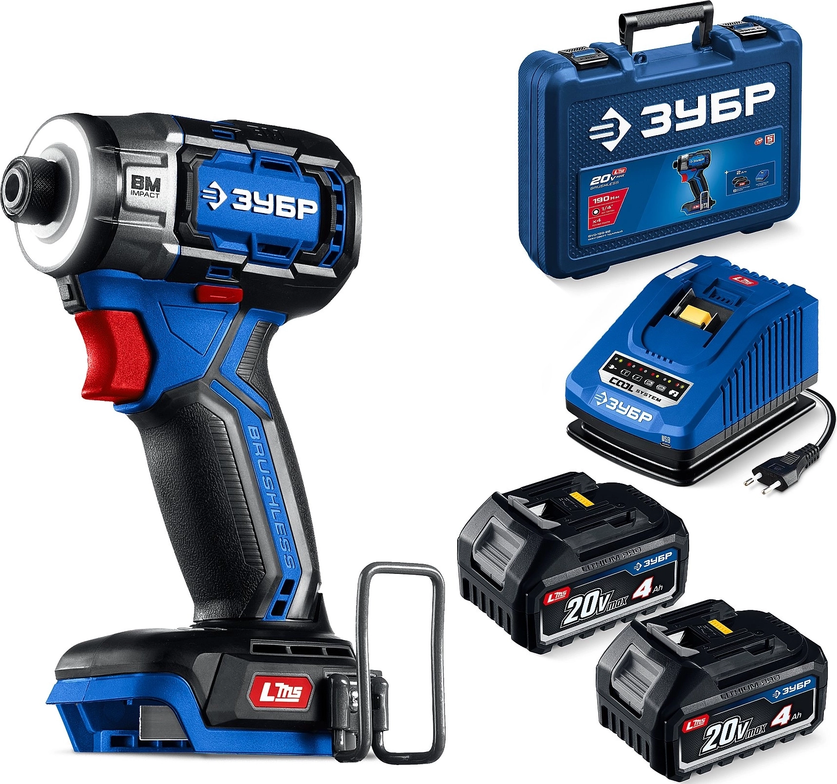 ПРОФЕССИОНАЛ 20 В, 190 Н·м, 2 АКБ LMS (4 А·ч), бесщеточный ударный винтоверт, кейс арт. 121477