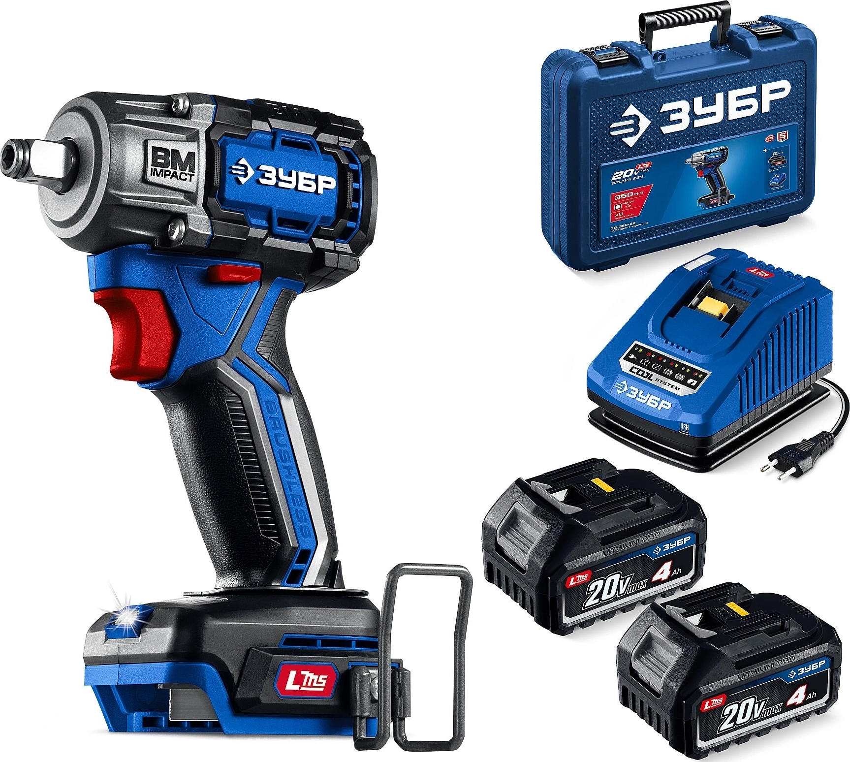 ПРОФЕССИОНАЛ 20 В, 350 Н·м, 2 АКБ LMS (4 А·ч), бесщеточный ударный гайковерт, кейс арт. 121480