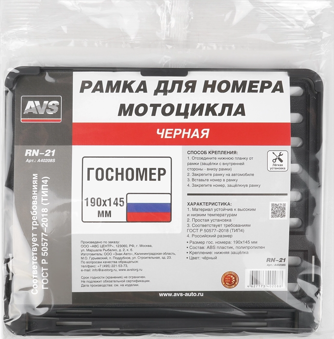 Рамка под номерной знак мотоцикла (чёрная) ТИП4 190х145 мм AVS RN-21