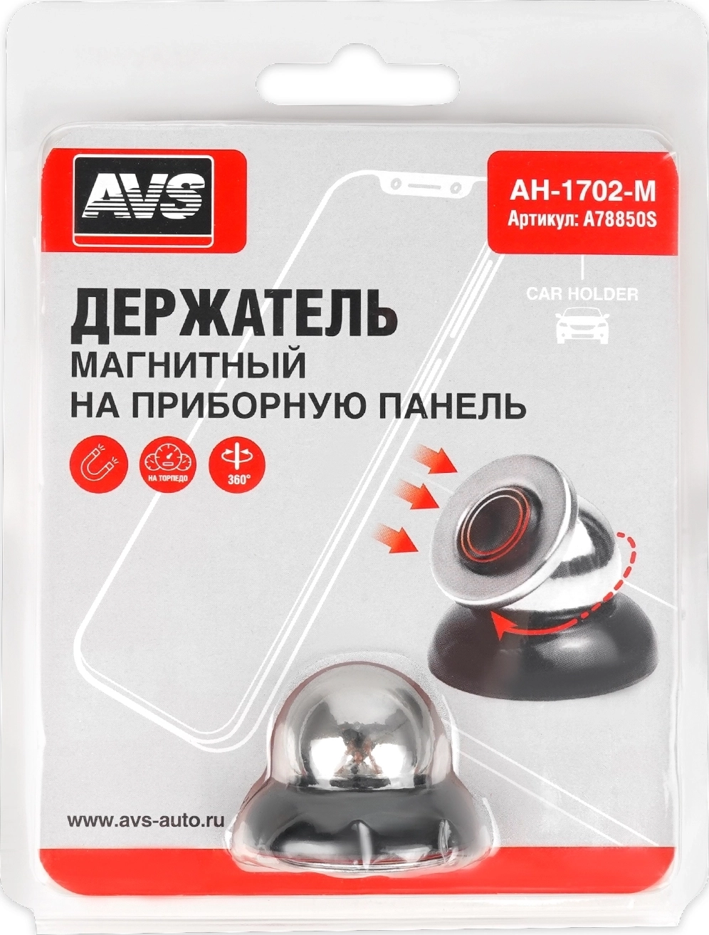 Автомобильный держатель AVS Comfort AH-1702-M - для смартфонов шириной от 4 до 12 см, установка на приборную панель, магнитное крепление, прочная фиксация, поворот на 360 градусов, металлическая пластина в комплекте