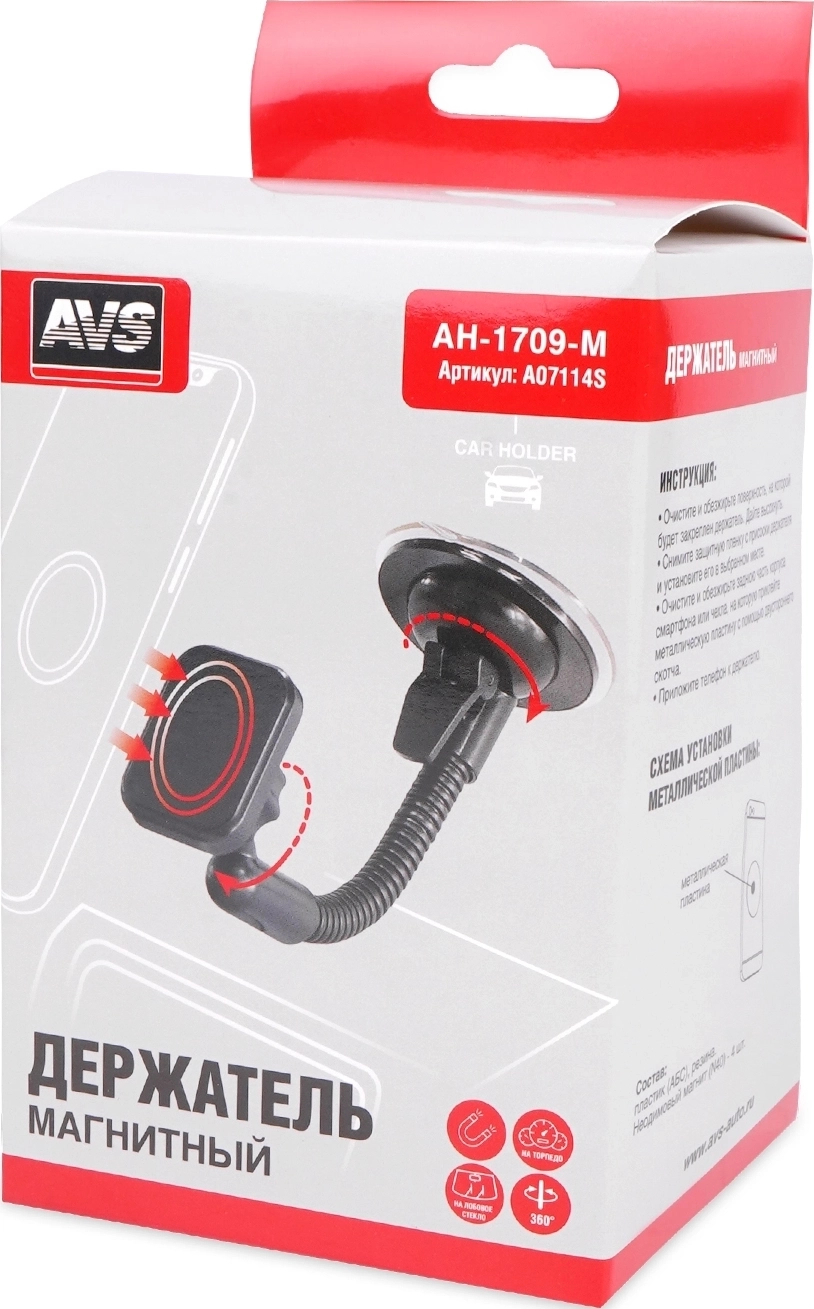 Автомобильный держатель AVS Comfort AH-1709-M - для смартфонов шириной от 4 дое 12 см, установка на стекло, магнитное крепление, прочная фиксация, поворот на 360 градусов