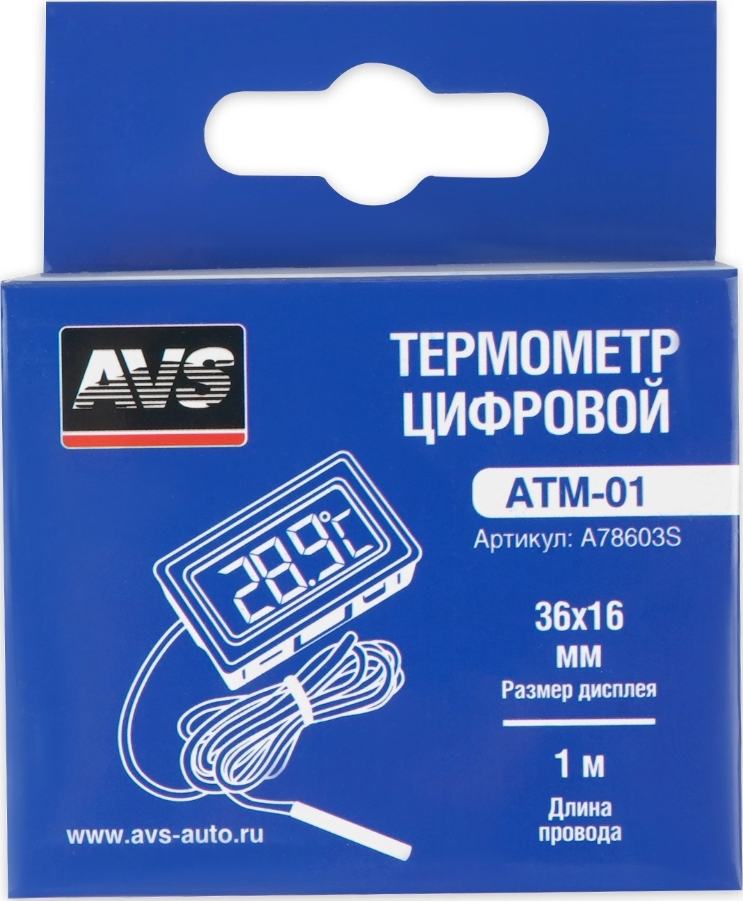 Термометр AVS ATM-01 - ЖК-экран, длина провода 1 м, размер дисплея 36x16 мм, питание LR44/AG13 2 шт., размер устройства 48x28,6x14,4 мм