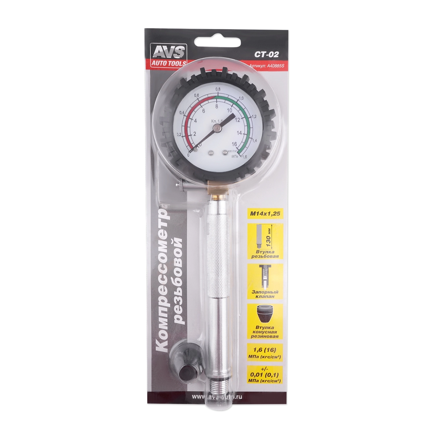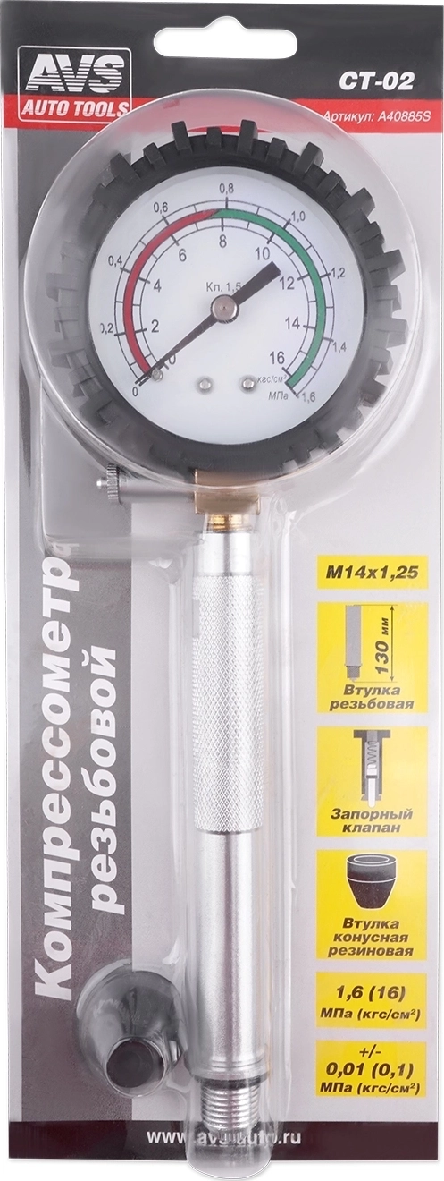 Компрессометр AVS CT-02 - с резьбовой втулкой 130 мм, резьба М14х1.25, верхний предел измерения давления 1,6 МПа (16 кгс/см²)