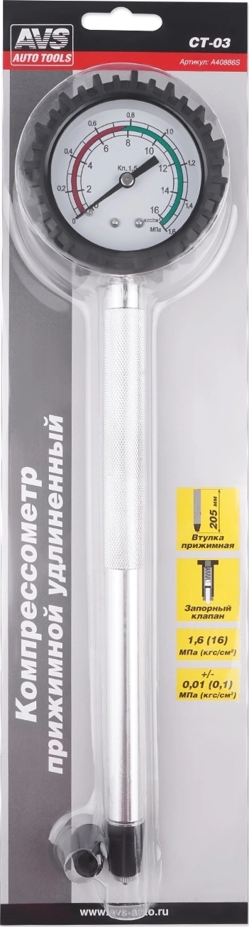 Компрессометр AVS CT-03 - прижимной удлиненный, верхний предел измерения давления, МПа(кгс/см²) - 1,6 (16)