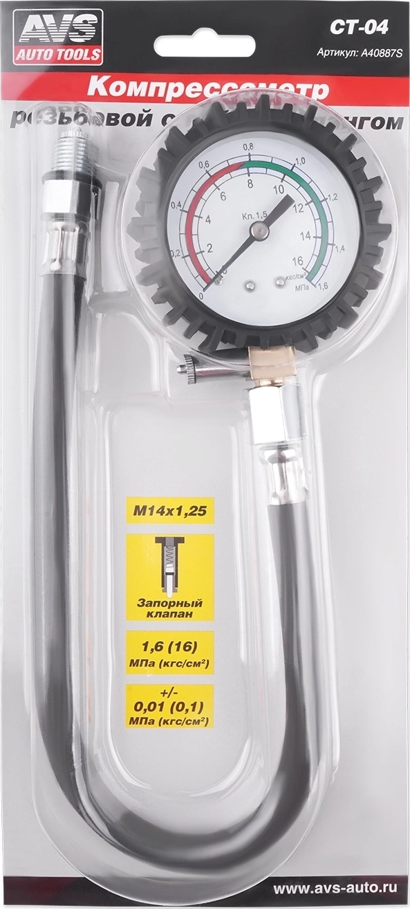 Компрессометр AVS CT-04 - резьбовой, с гибким шлангом, резьба М14х1.25, верхний предел измерения давления 1,6 МПа (16 кгс/см²)