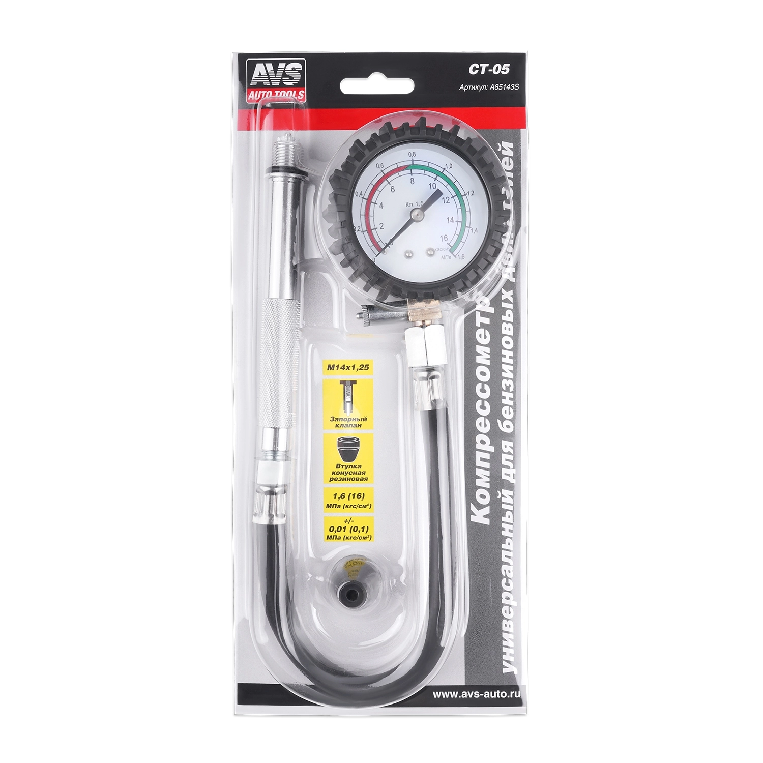 Компрессометр AVS CT-05 - резьбовой, с гибким шлангом, резьба М14х1.25, верхний предел измерения давления 1,6 МПа (16 кгс/см²)