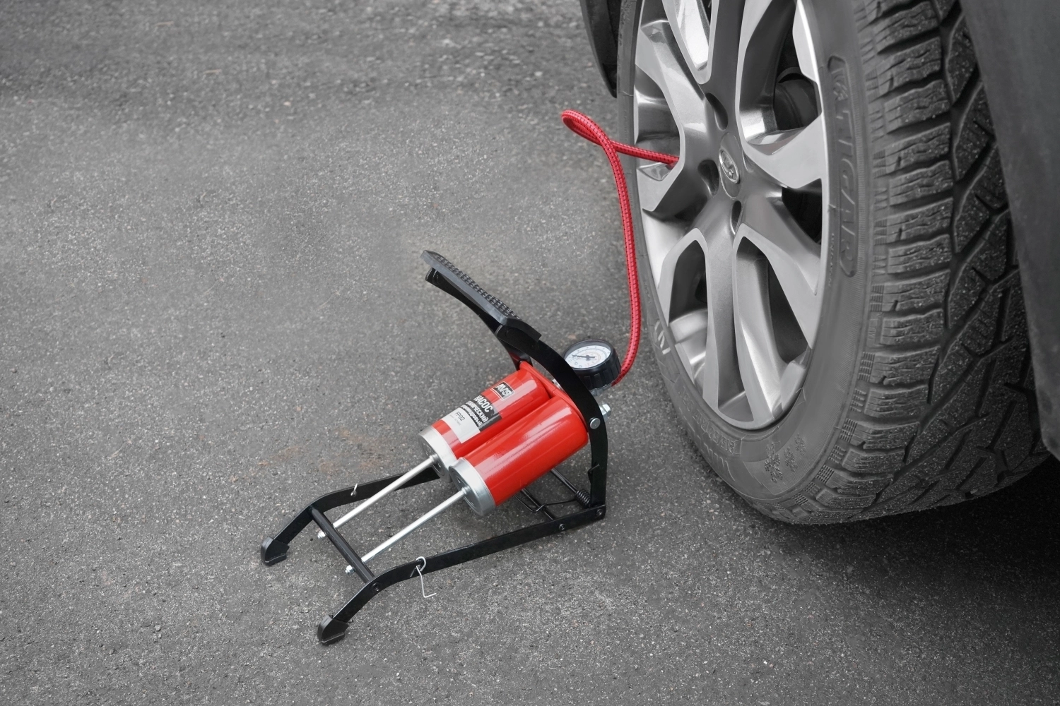 Насос состоит из опорной рамы, педали, поршня со штоком, 2х цилиндров, возвратной пружины, манометра со шлангом и невозвратным клапаном.