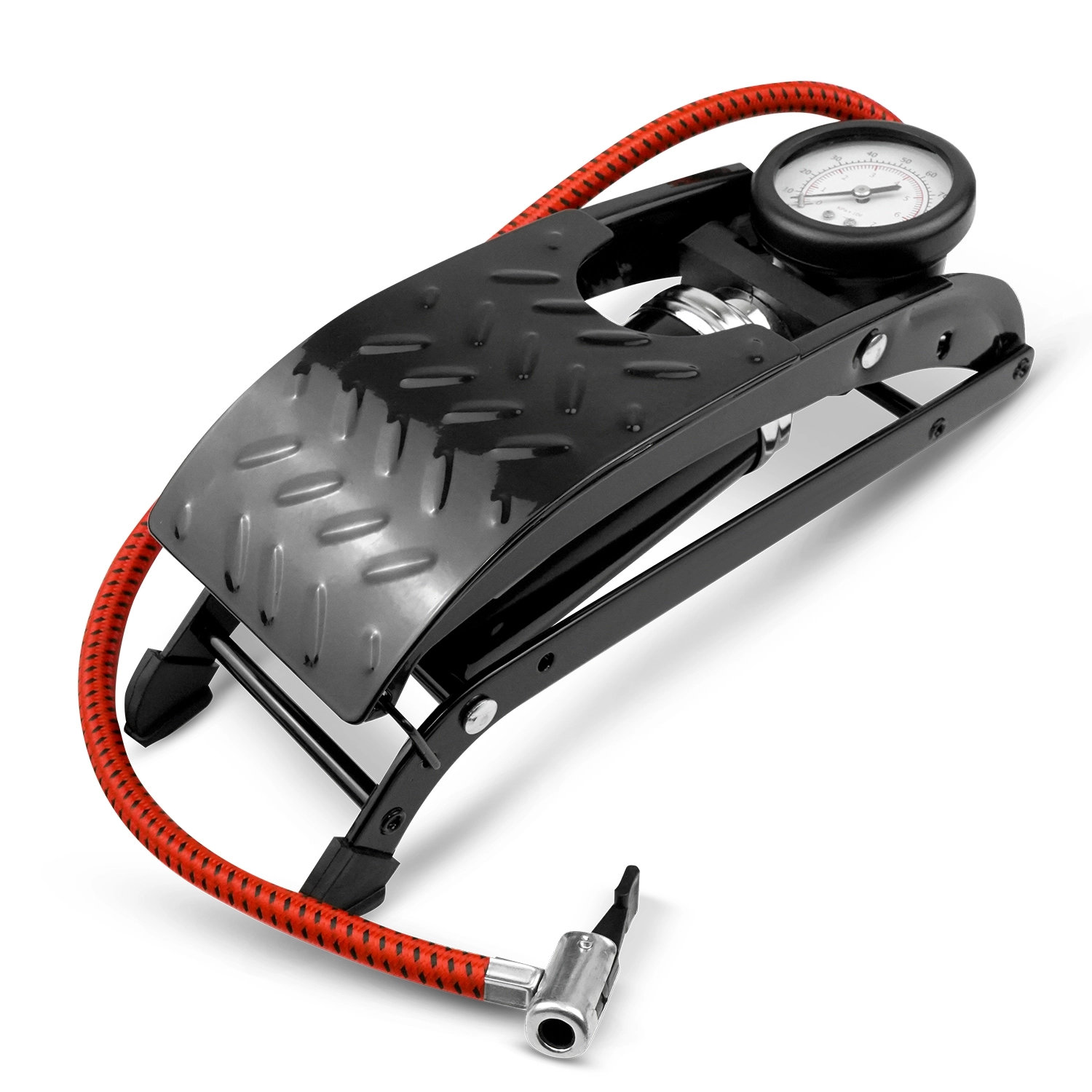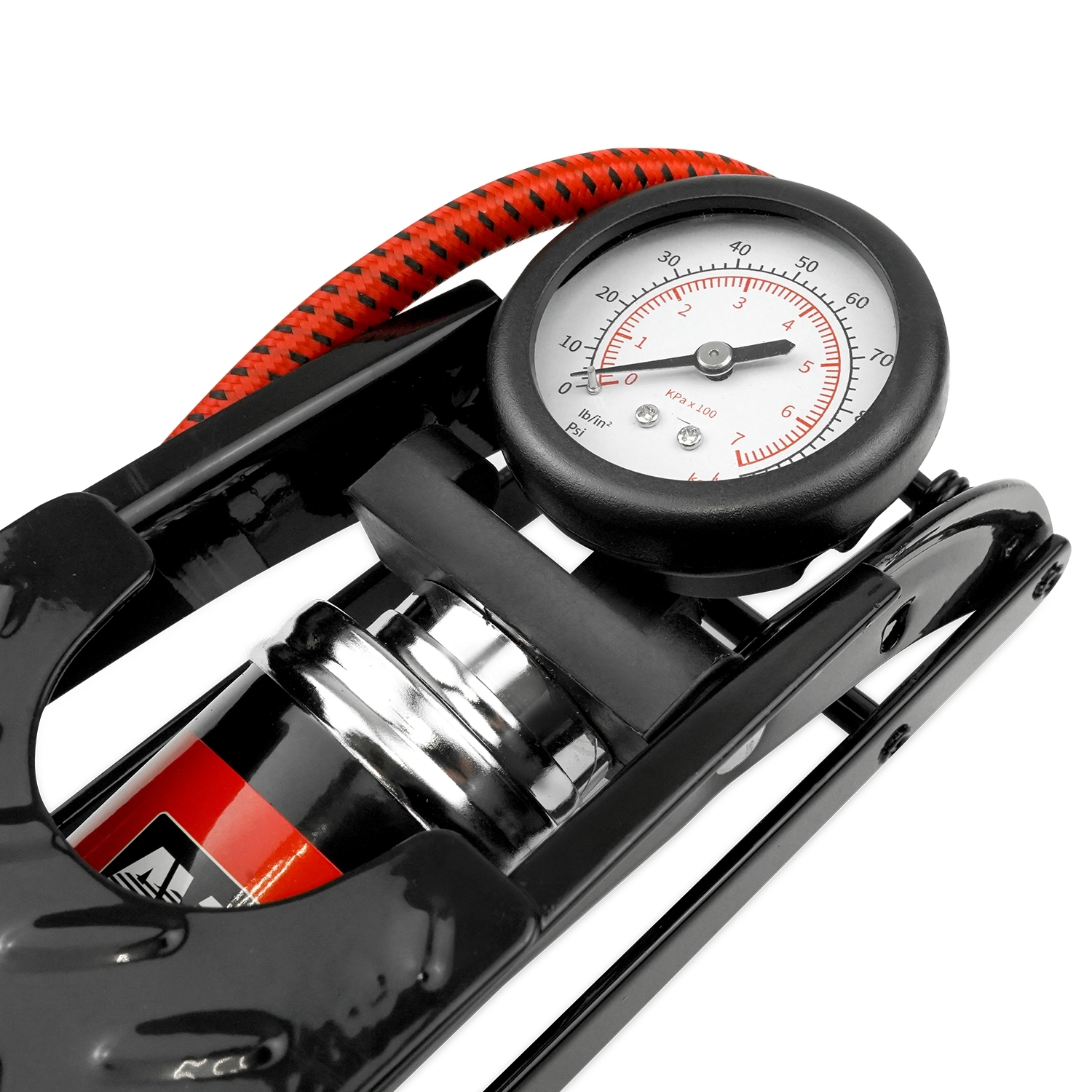 Насос с усиленной конструкцией состоит из опорной рамы, педали, поршня со штоком, цилиндра, механизма высокого давления, возвратной пружины, манометра со шлангом и невозвратным клапаном.