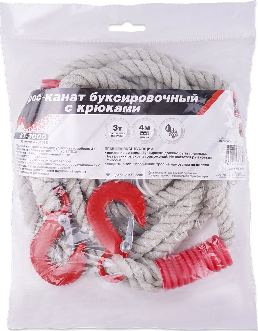 Трос-канат буксировочный с крюками AVS KT-3000 - разрывная нагрузка 3 тонны , длина 4 метра