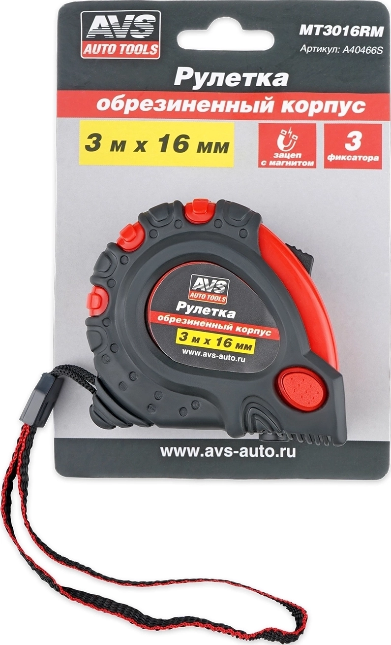 Рулетка AVS MT3016RM 3м х 16 мм (1 шт.) - обрезиненный корпус, 3 фиксатора, зацеп с магнитом