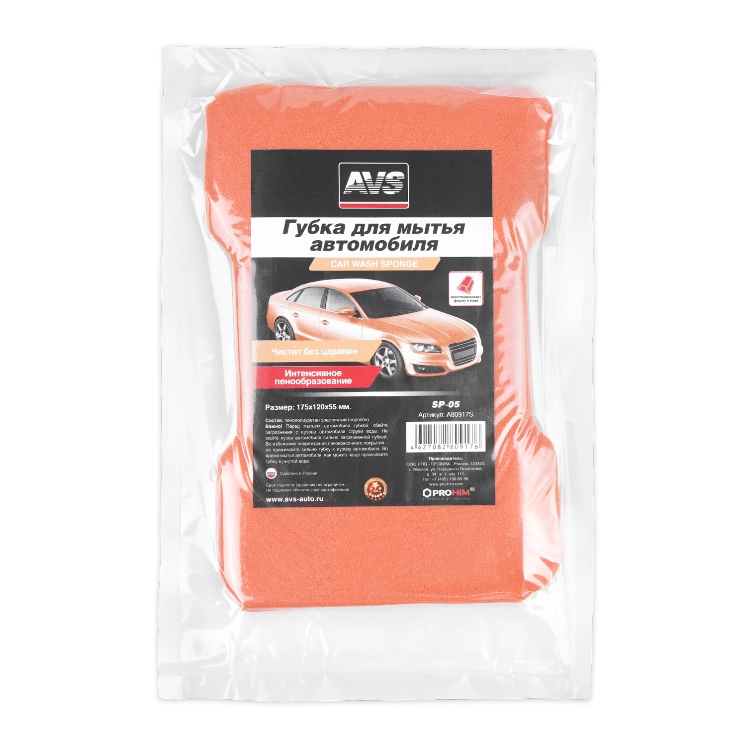 Губка AVS SP-05 поролоновая в вакуумной упаковке - размер 175х120х55 мм, легкое удаление грязи, отличное впитывание влаги, не оставляет царапин
