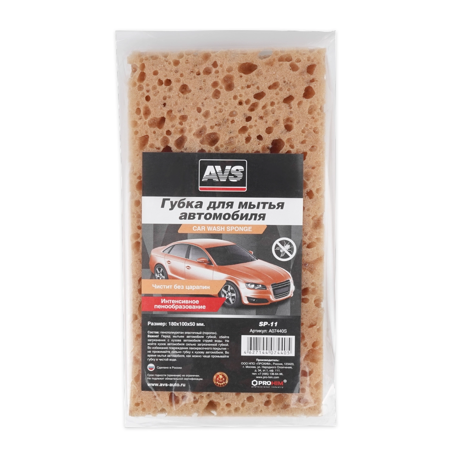 Губка AVS SP-11 поролоновая - размер 180x100x50 мм, легкое удаление грязи, отличное впитывание влаги, не оставляет царапин