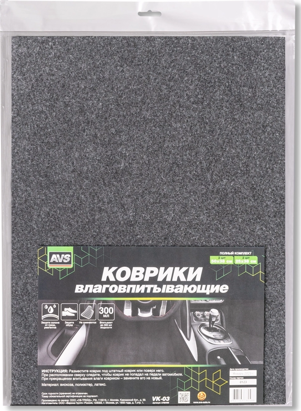 Коврик кладется под штатный коврик. Защищает обувь и салон от грязи, влаги, соли, реагентов, следов нефтепродуктов. Коврики можно использовать как в автомобиле, так и в доме, квартире в качестве придверного коврика или для сушки обуви.; легко заменяются. Размер -50 х 38 см., 25 х 38 см.; цвет черный; материал - вискоза, полиэстр, латекс.