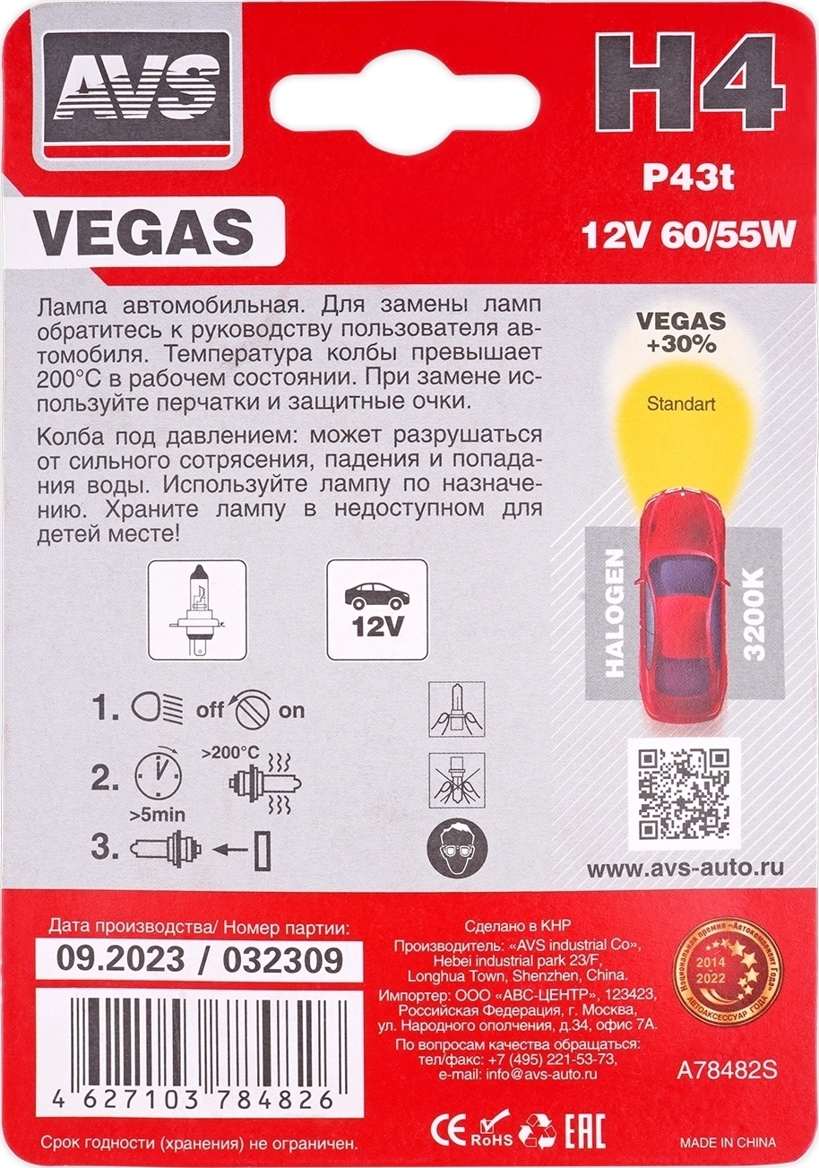 Галогенная лампа AVS Vegas H4 12V 60/55W 1шт. Цветовая температура: 3200 К. Мощность: 60/55W. Напряжение: 12V. Цоколь: P43t (H4). Свет: теплый белый.