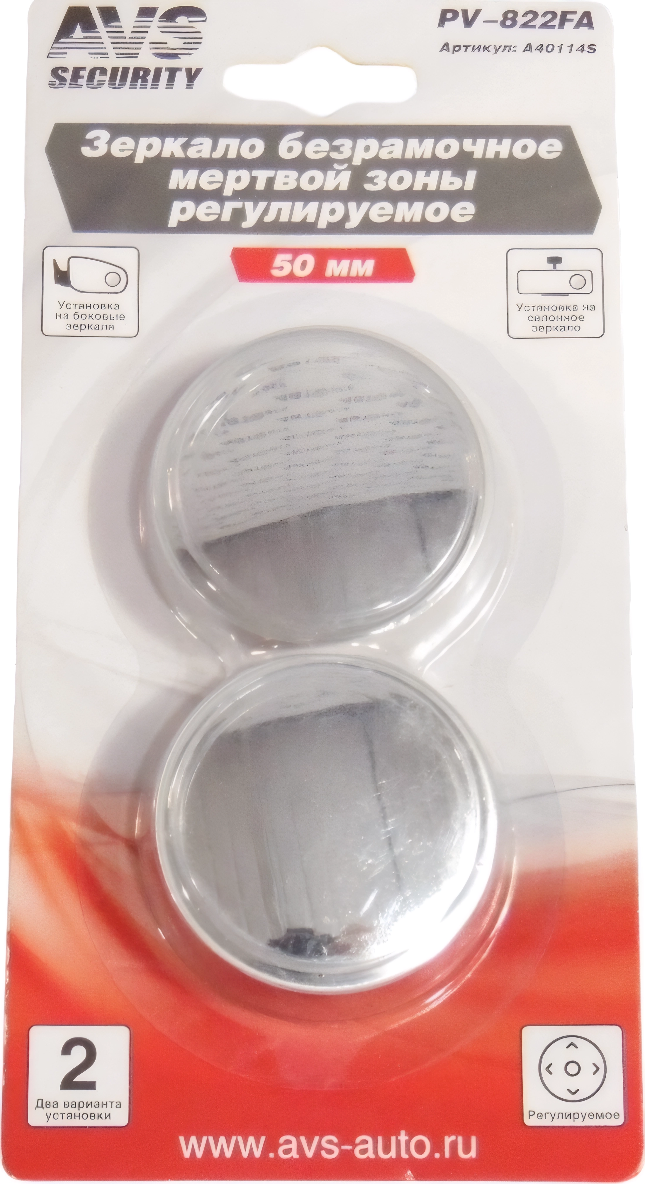 Зеркало мертвой зоны AVS PV-822FA (комплект 2шт) - регулируемое, безрамочное, круглое, размер 50х50 мм