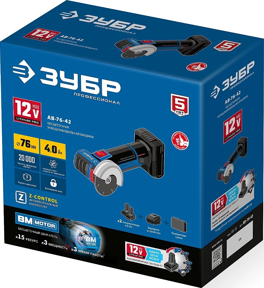 Аккумуляторная УШМ бесщеточная ЗУБР 12 В, D76мм, 2 АКБ Т7 4 Ач, сумка
