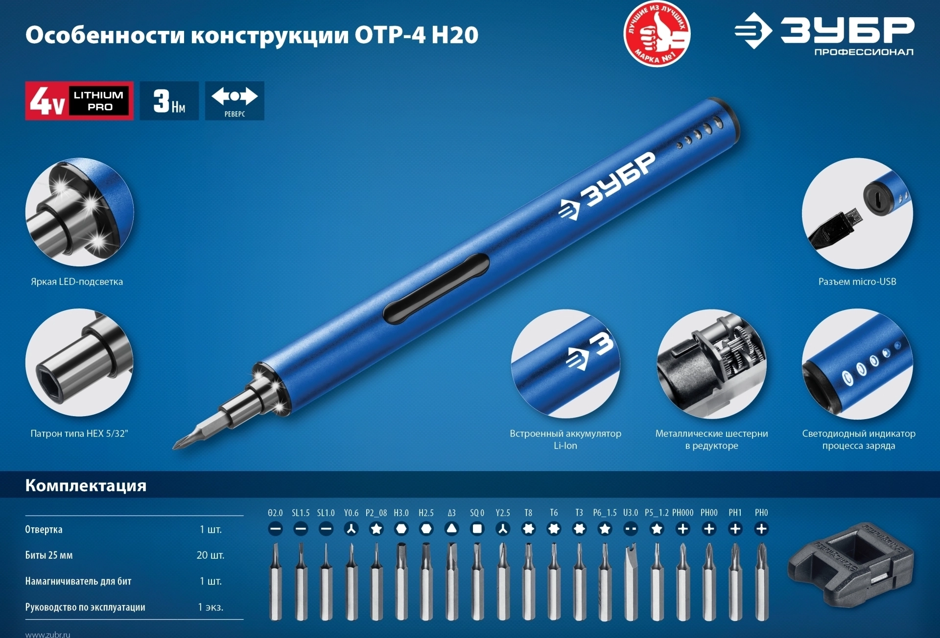 Аккумуляторная отвертка ЗУБР 4 Vmax для точных работ 20 бит