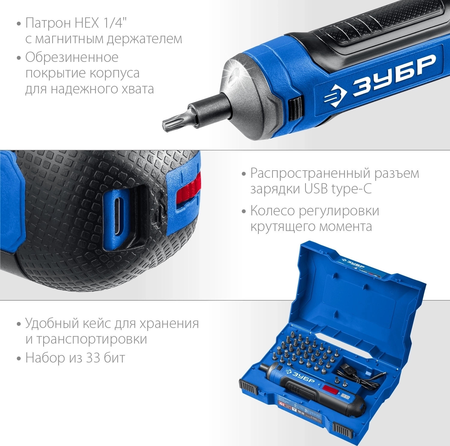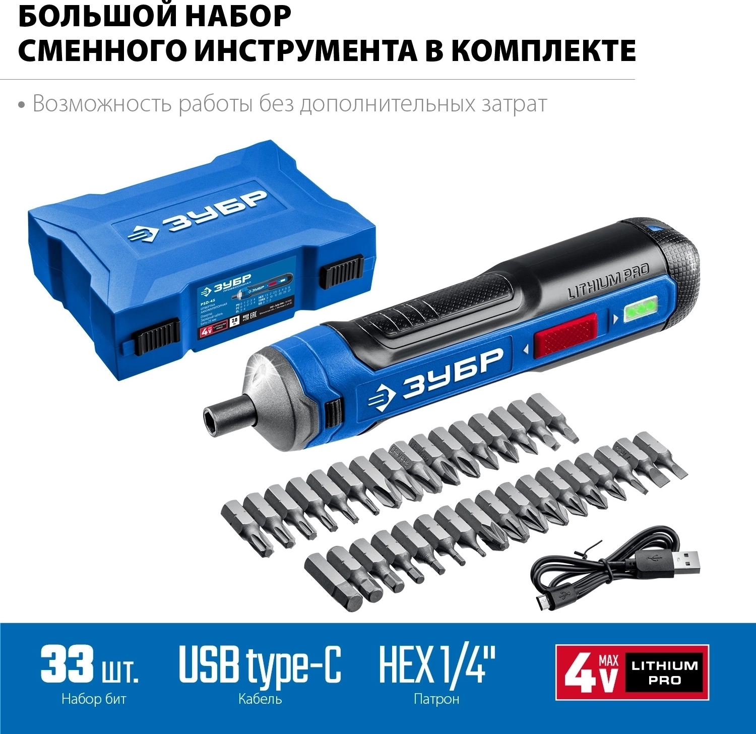 Аккумуляторная отвертка ЗУБР ZUBR GO 4 Vmax кейс 33 биты