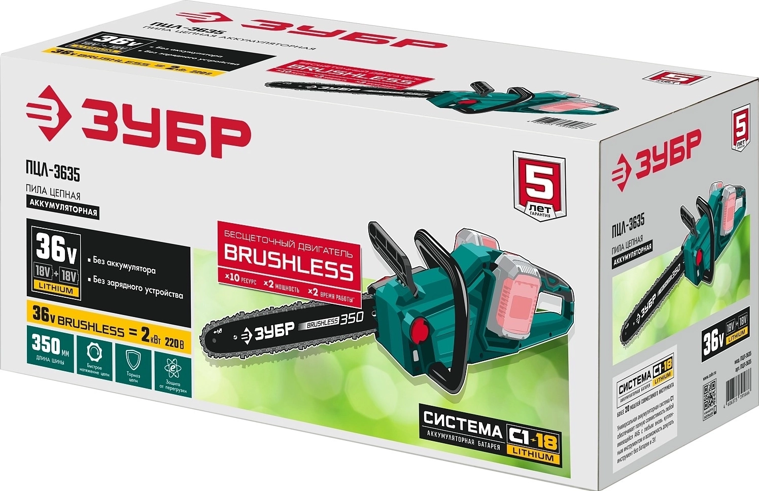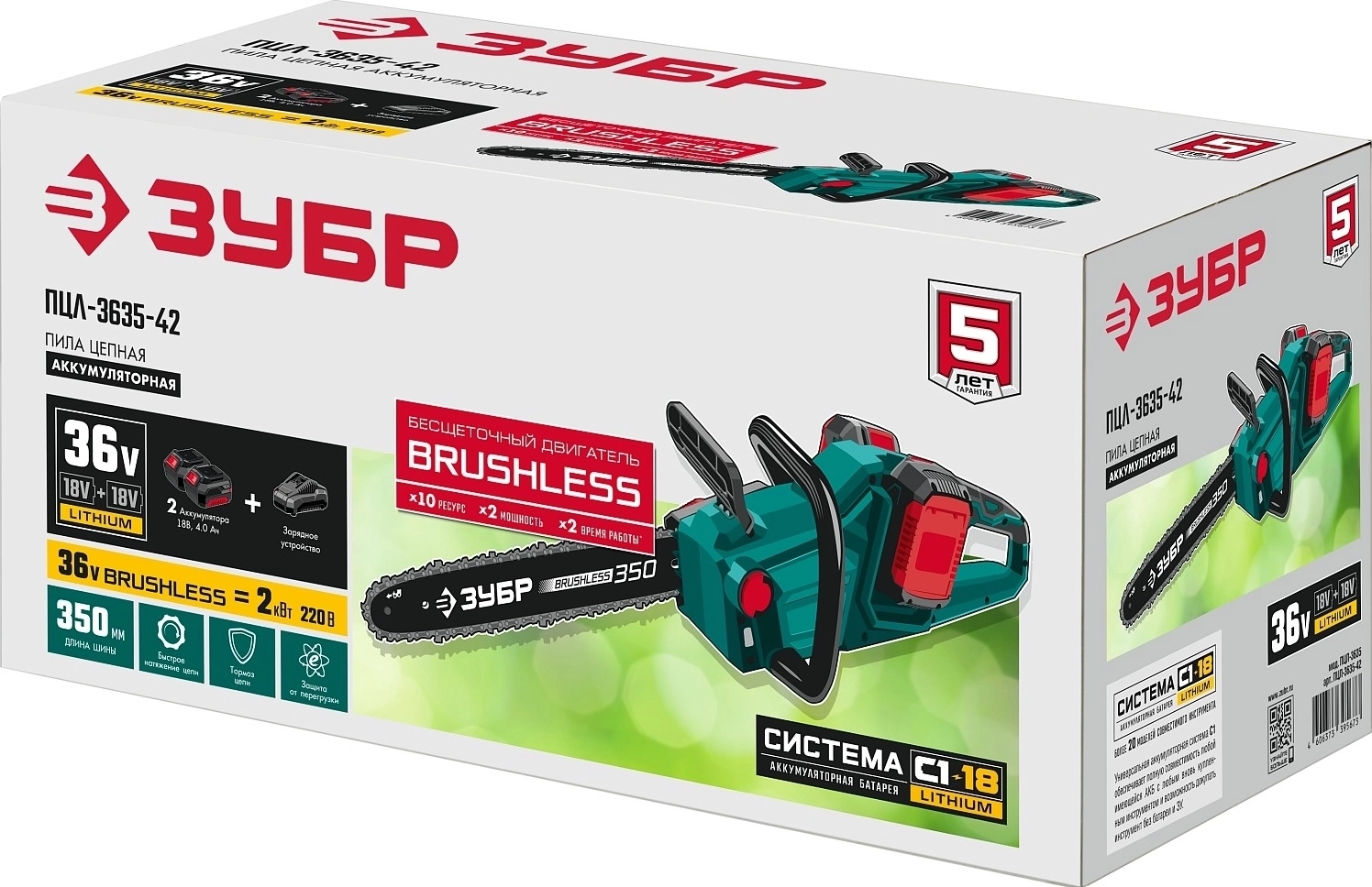 Бесщеточная цепная пила С1-18, 36 В, 35 см шина, 2х18 В АКБ (4 А·ч) арт. 110661