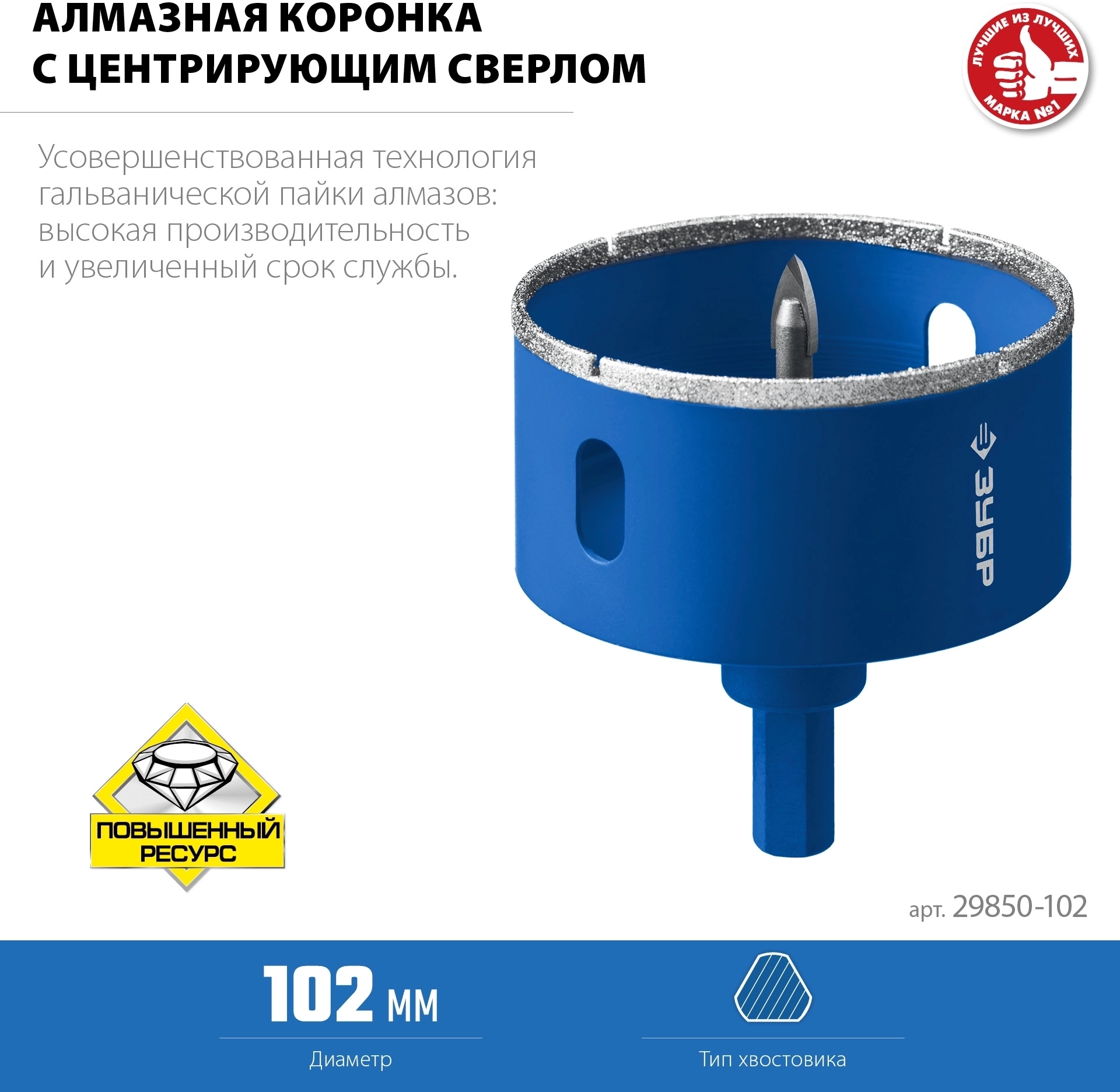 Алмазная коронка Профессиона ЗУБР АГК d 102 мм центр. сверло трехгр. хвост Р60