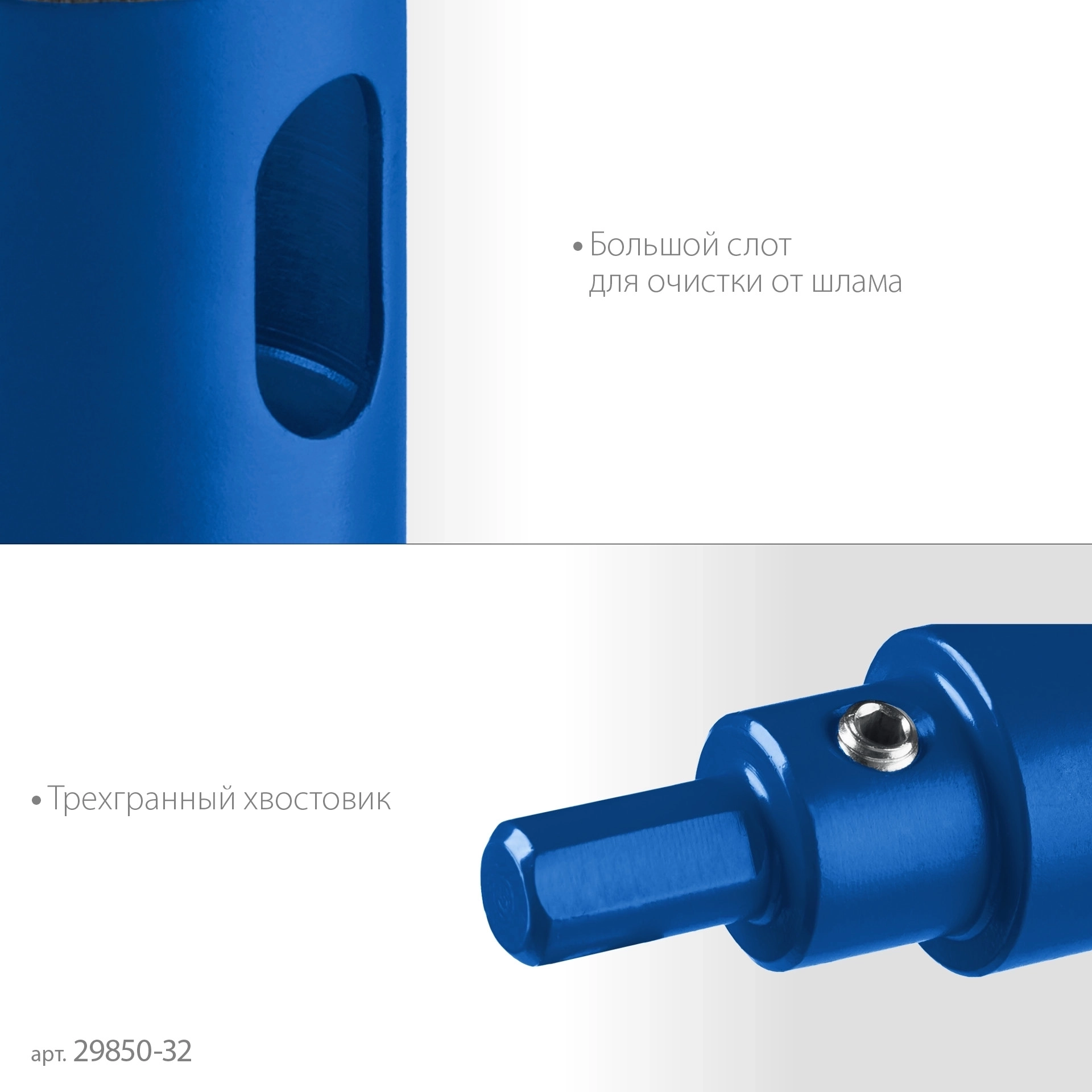 - Трехгранный хвостовик для предотвращения проворачивания в сверлильном патроне.