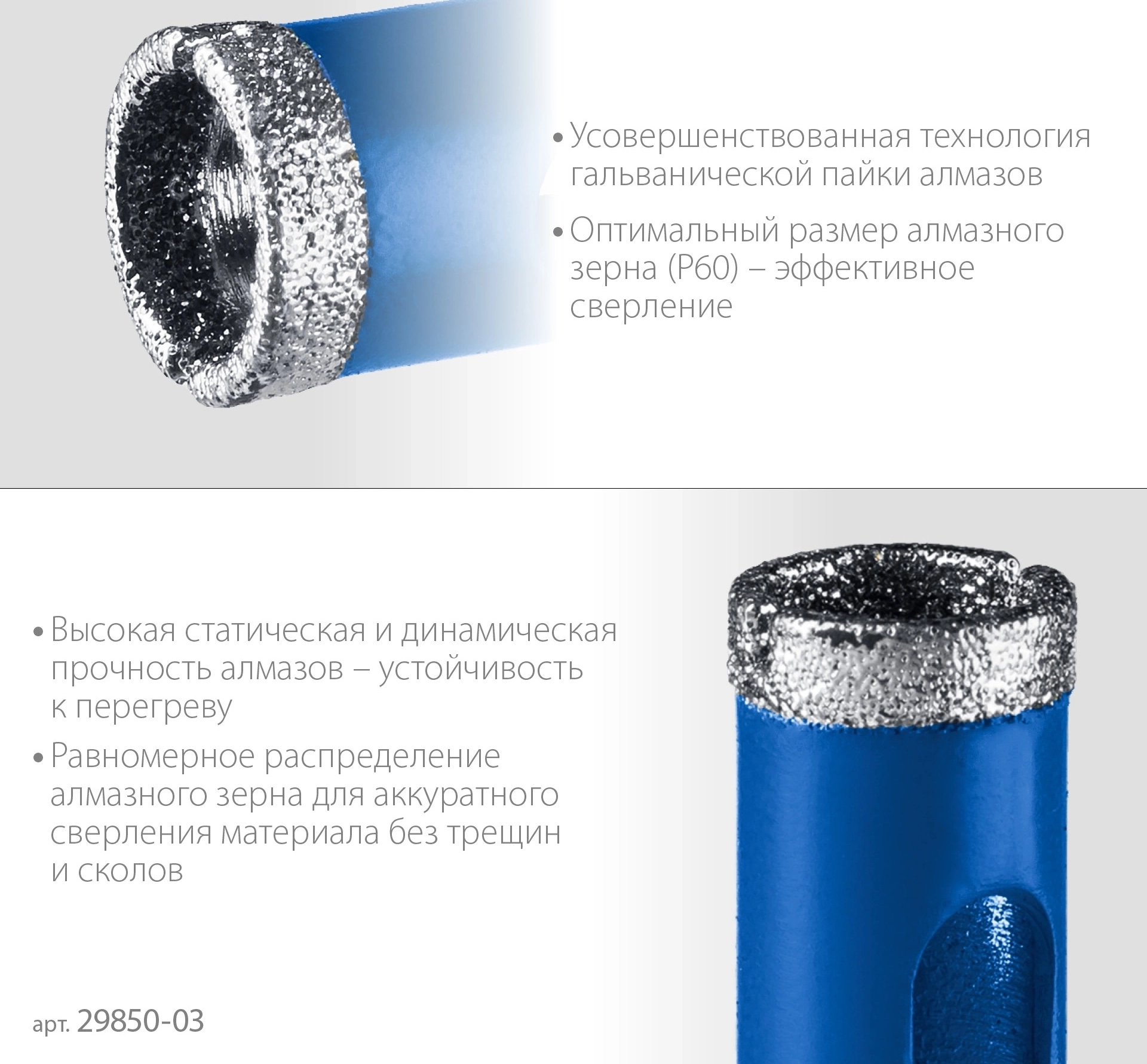 - Равномерное распределение алмазного зерна обеспечивает аккуратное сверление материала без трещин и сколов.