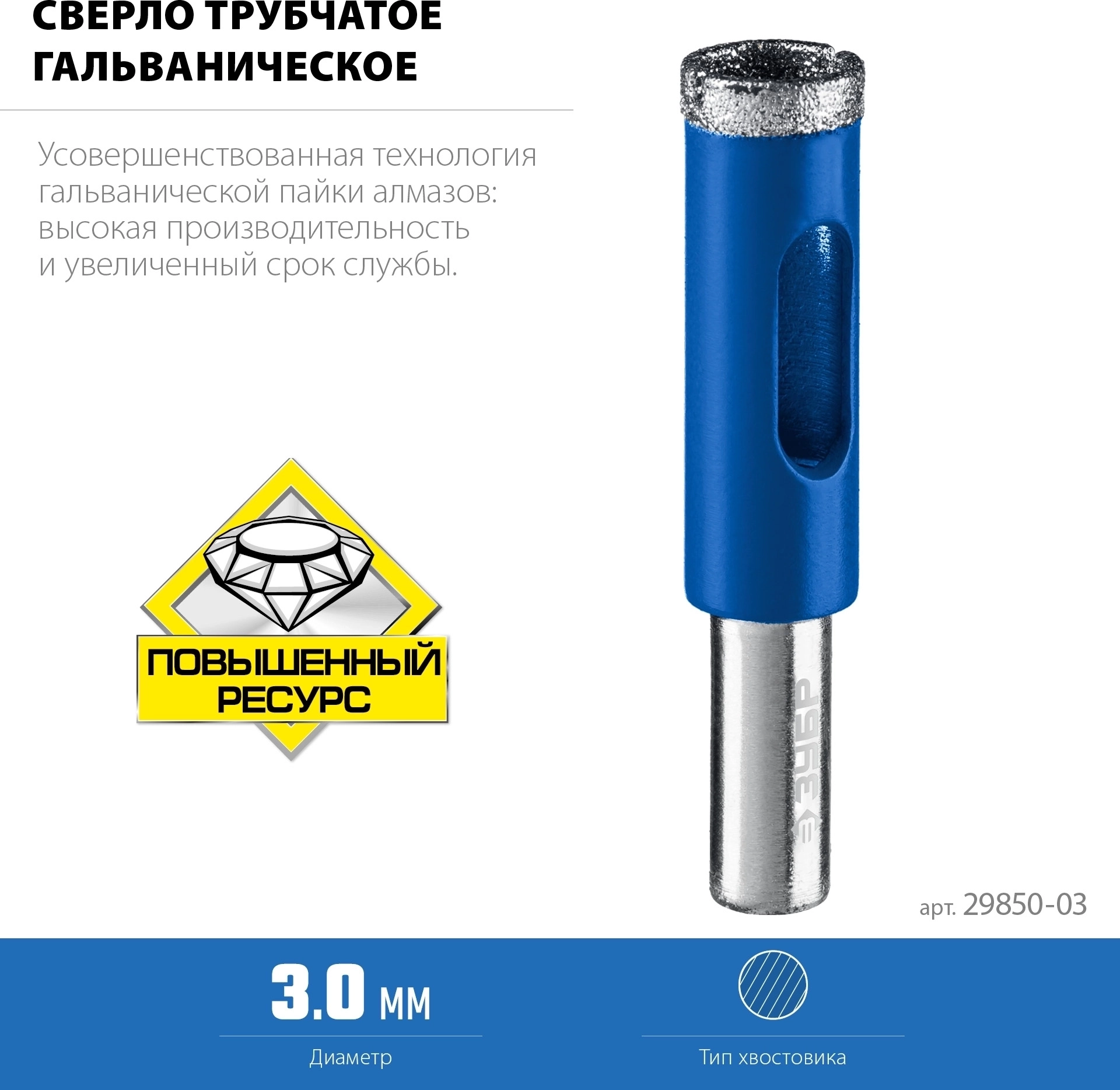 Алмазное трубчатое сверло ЗУБР АГК d 3 мм трехгр. хвост Р60