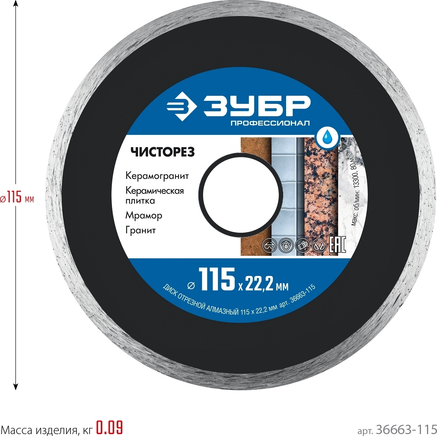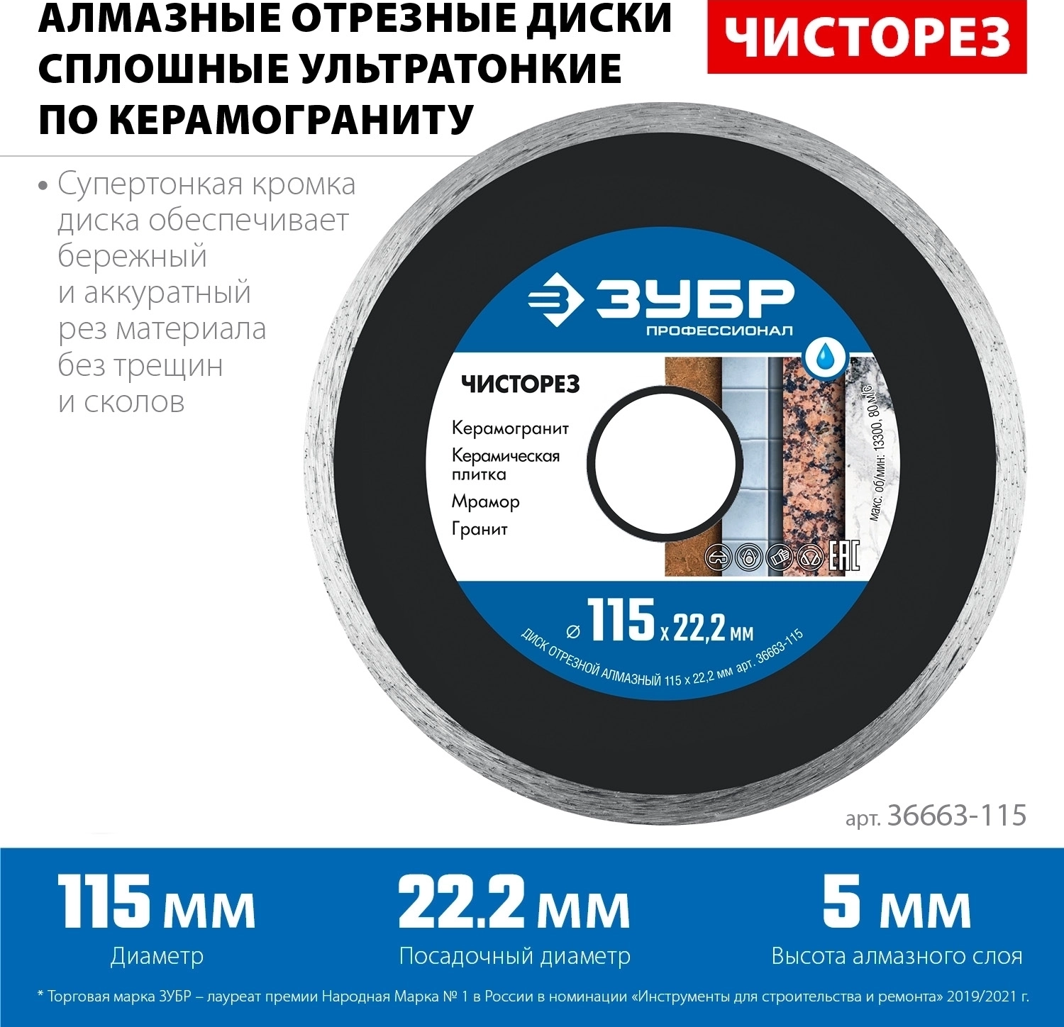 Алмазный диск сплошной ЗУБР Чисторез 115 мм 22.2 мм 5 х 1.1 мм