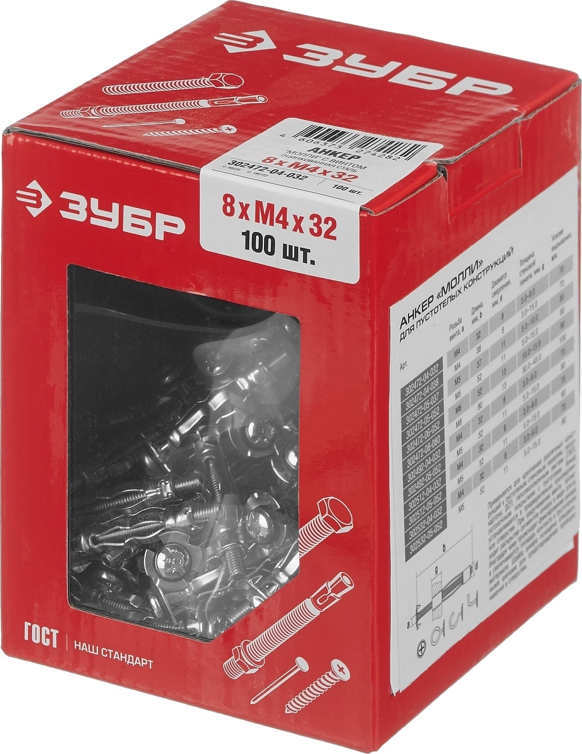 Анкер для пустотелых конструкций ЗУБР МОЛЛИ, М4 х 32 х 8 мм, 100 шт