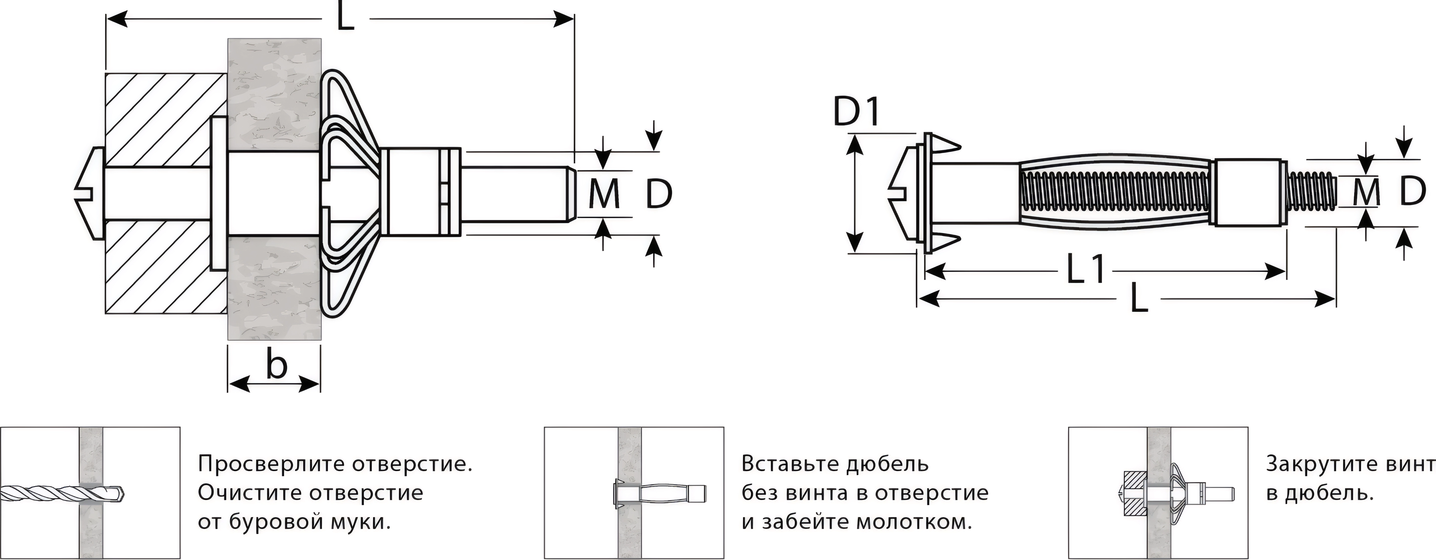 Для крепления различных конструкций к пустотелым стеновым панелям, гипсокартону, ДСП, гипсоволоконным листам (ГВЛ), потолочным покрытиям с пустотами. Установка анкера производится при помощи заклепочника для анкеров. Винт анкера имеет шлиц PH&SL.