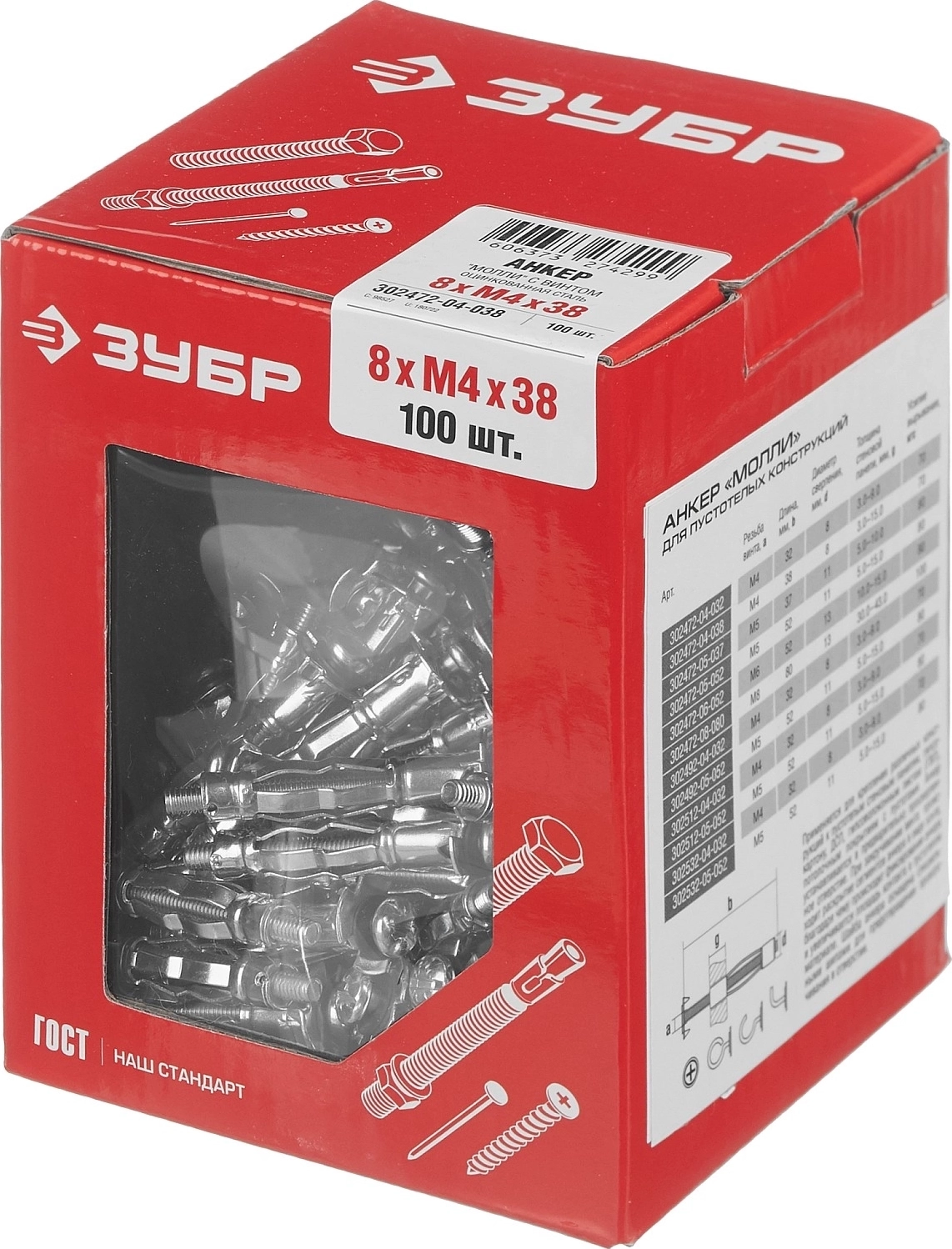 Анкер для пустотелых конструкций ЗУБР МОЛЛИ, М4 х 38 х 8 мм, 100 шт