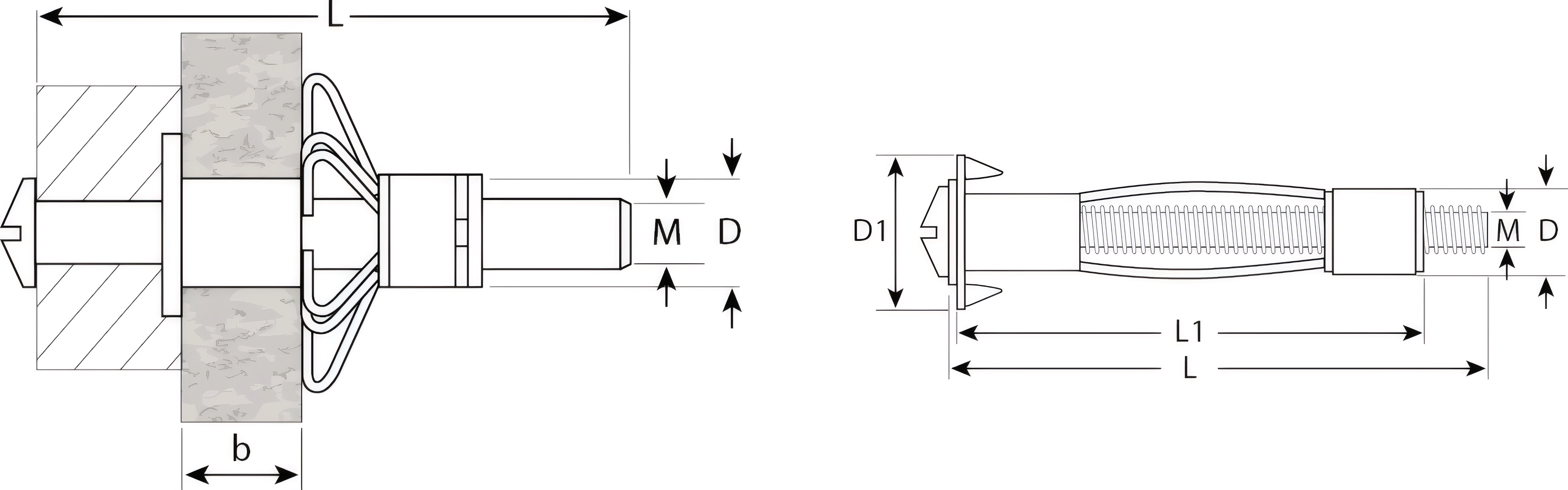 Для крепления различных конструкций к пустотелым стеновым панелям, гипсокартону, ДСП, гипсоволоконным листам (ГВЛ), потолочным покрытиям с пустотами. Анкер устанавливается в предварительно просверленное и очищенное от буровой муки отверстие.