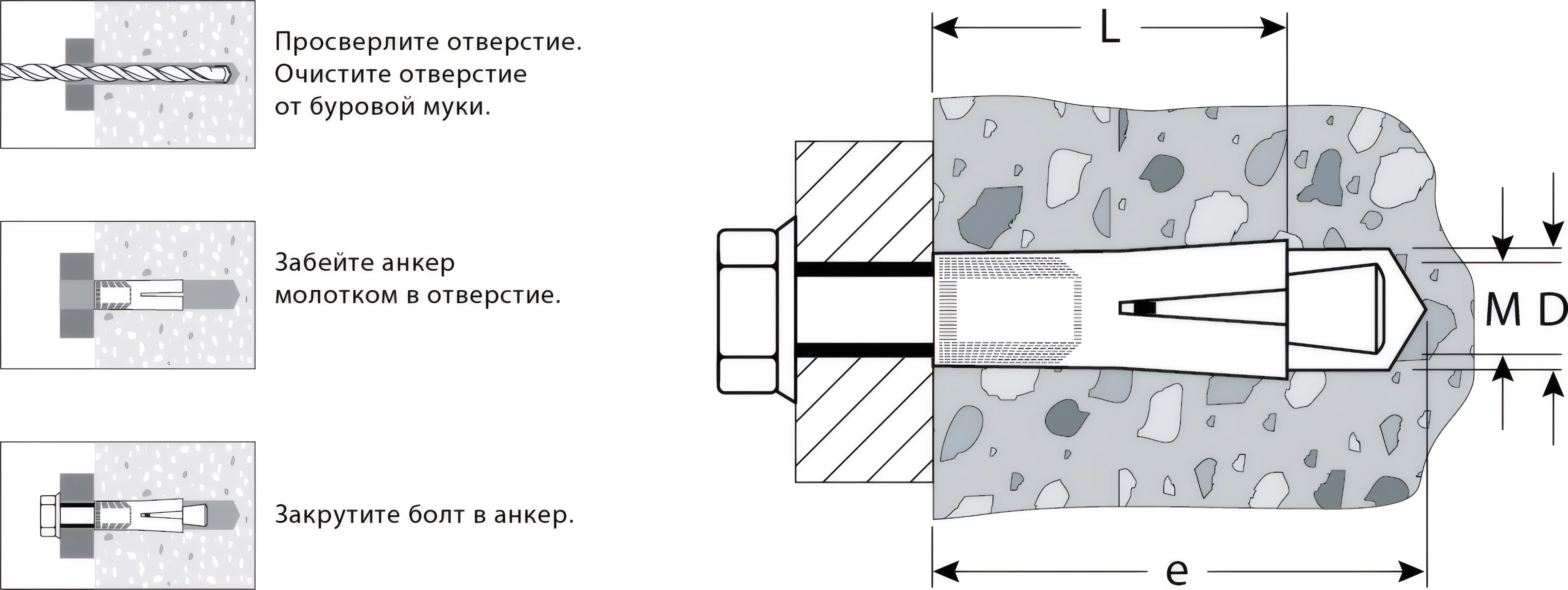 Для монтажа конструкций к полнотелым основаниям: поверхностям из бетона, полнотелого кирпича или природного камня. Анкер устанавливается в предварительно просверленное и очищенное от буровой муки отверстие и расклинивается при закручивании болта