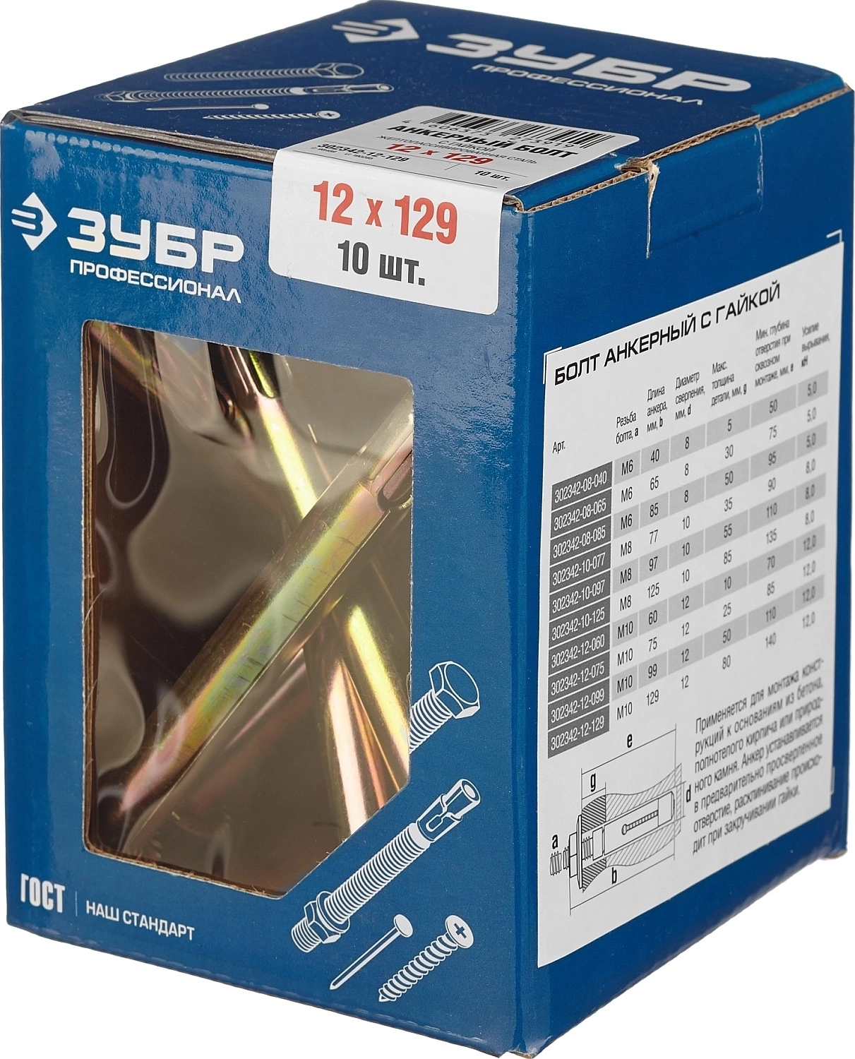 Анкерный болт с гайкой ЗУБР М12 х 129 мм 10 шт