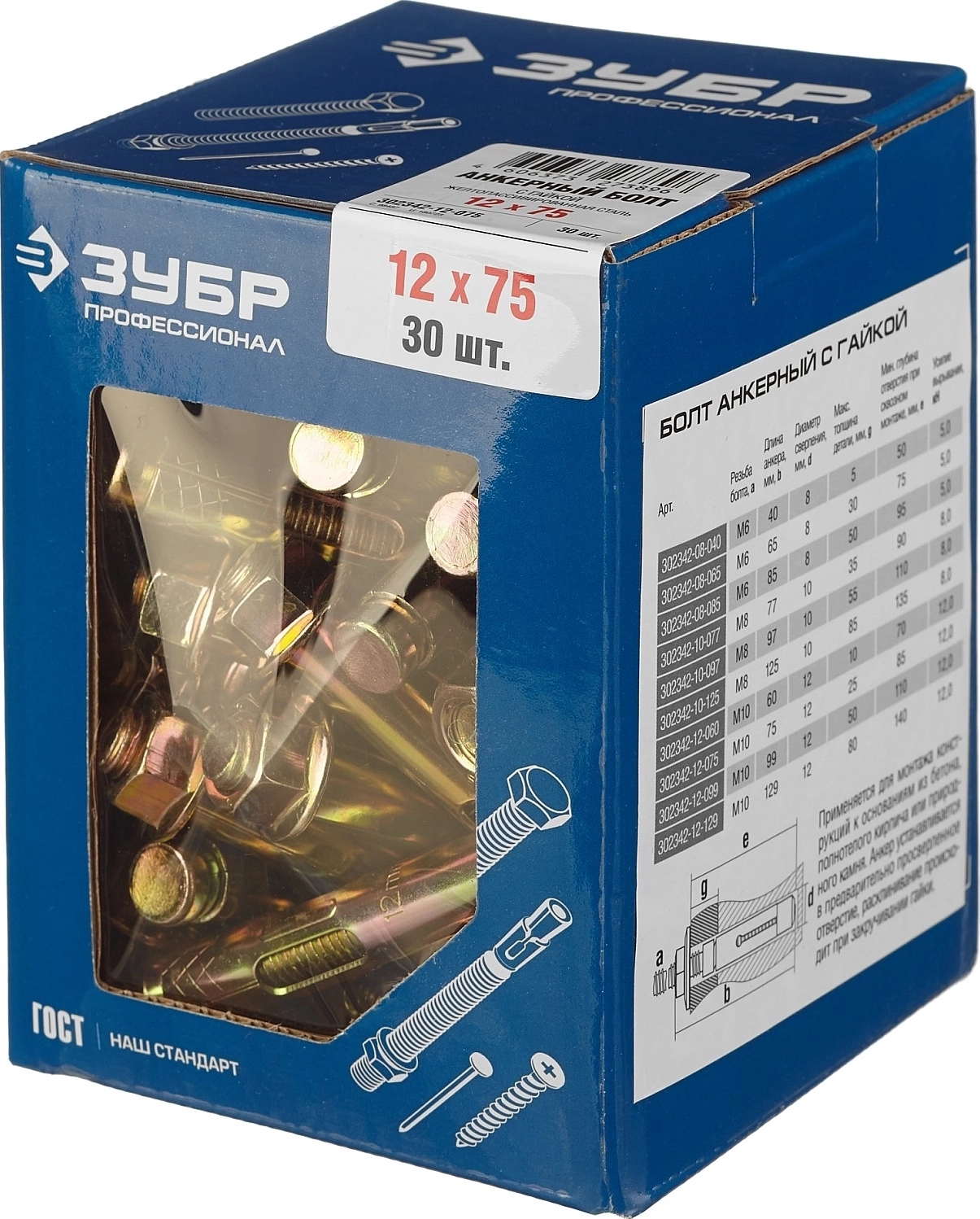 Анкерный болт с гайкой ЗУБР М12 х 75 мм 30 шт
