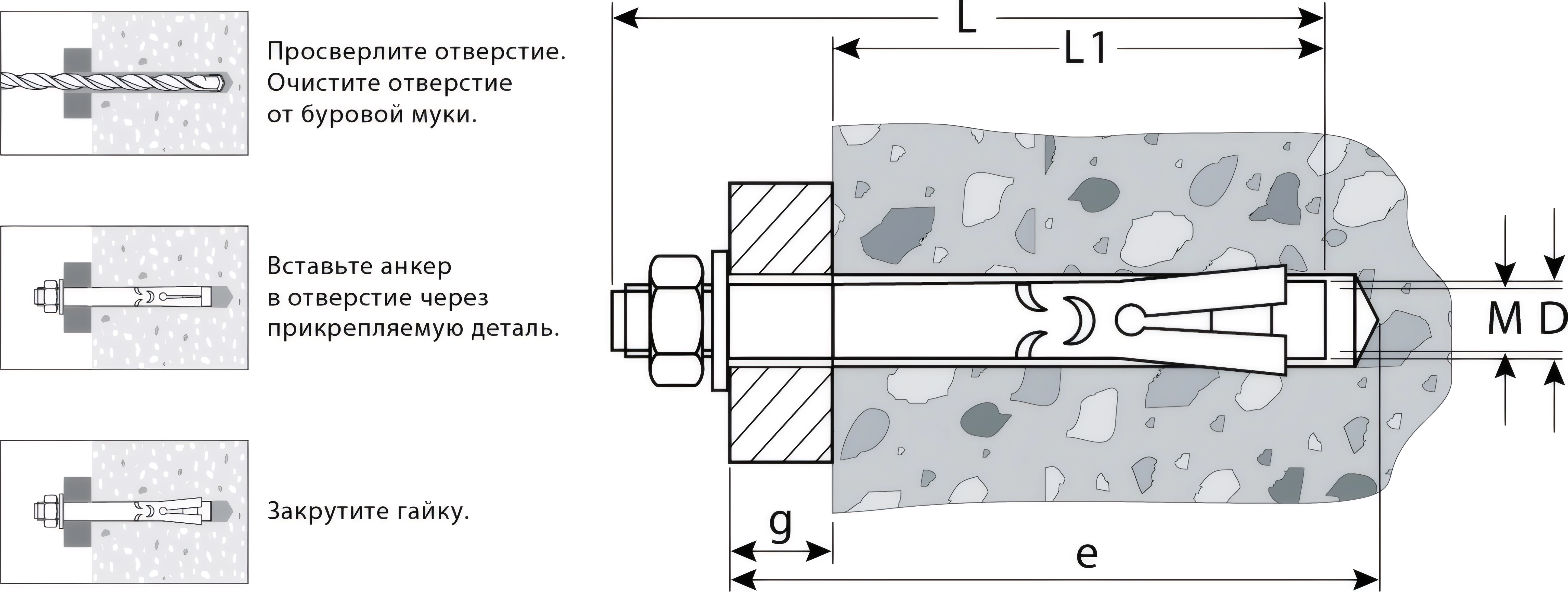 Для монтажа конструкций к полнотелым основаниям: поверхностям из бетона, полнотелого кирпича или природного камня. Анкер устанавливается в предварительно просверленное и очищенное от буровой муки отверстие и расклинивается при закручивании гайки