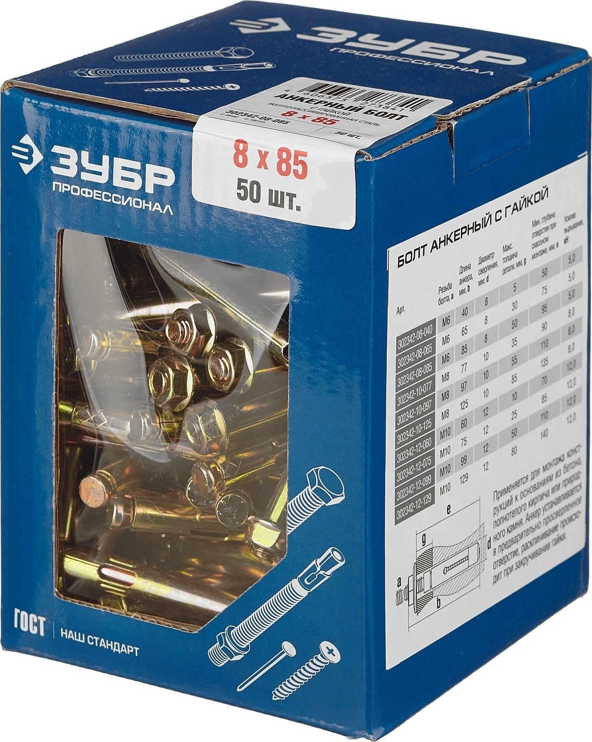 Анкерный болт с гайкой ЗУБР М8 х 85 мм 50 шт