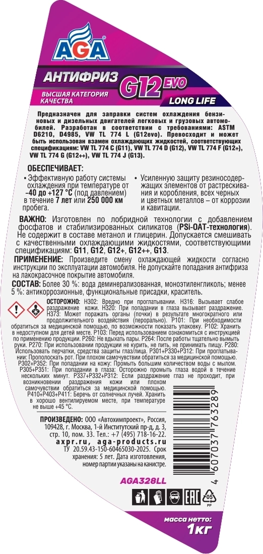 Антифриз готовый AGA G12 evo фиолетовый, -40С, 1кг