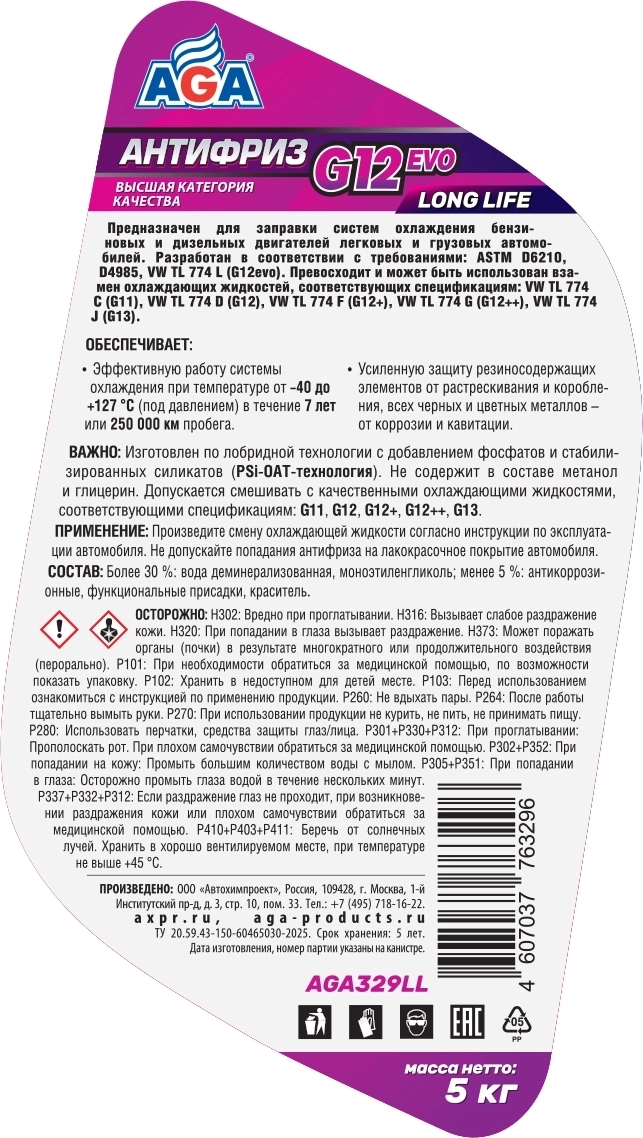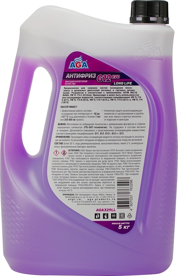 Антифриз готовый AGA G12 evo фиолетовый, -40С, 5кг