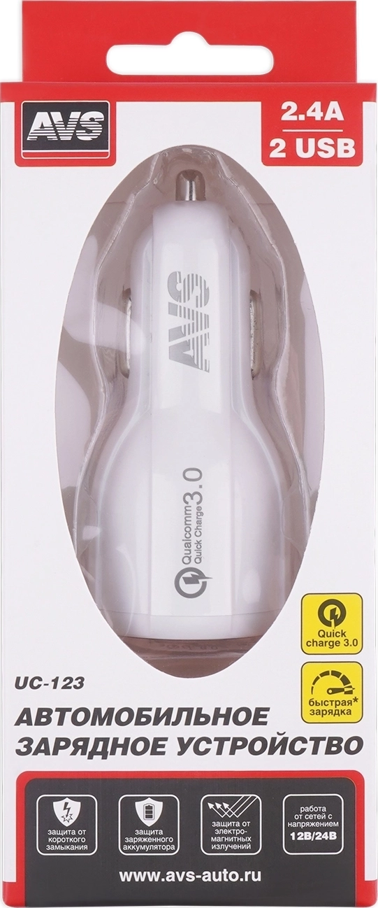 Автомобильное зарядное устройство AVS UC-123 Quick Charge - 2 x USB, максимальный ток 2,4А , выходное напряжение 5 В, напряжение питания 12-24В