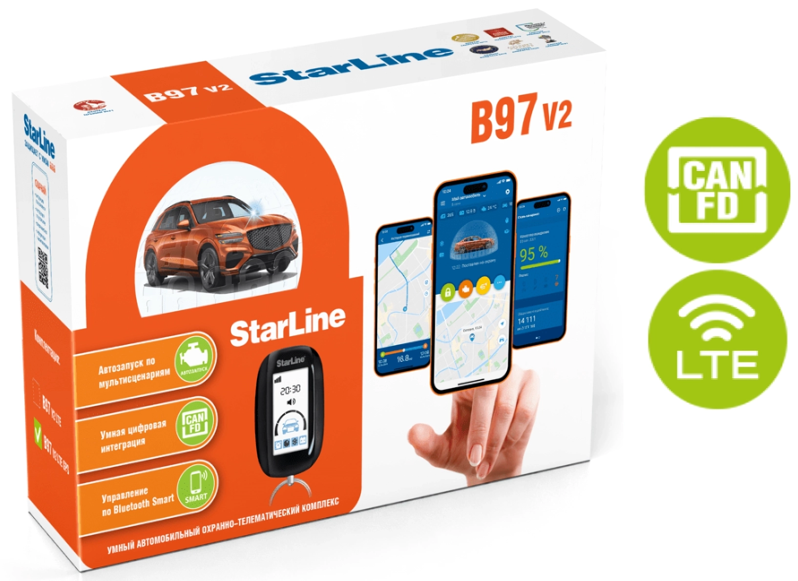 Автосигнализация StarLine B97 v2 3CAN+FD+4LIN LTE- диалоговая кодировка, радиоканал 868 Мгц, интегрированный Bluetooth, LTE модем, GPS-ГЛОНАСС, поддержка шин 3CAN-FD+4LIN, бесключевой обход иммобилайзера