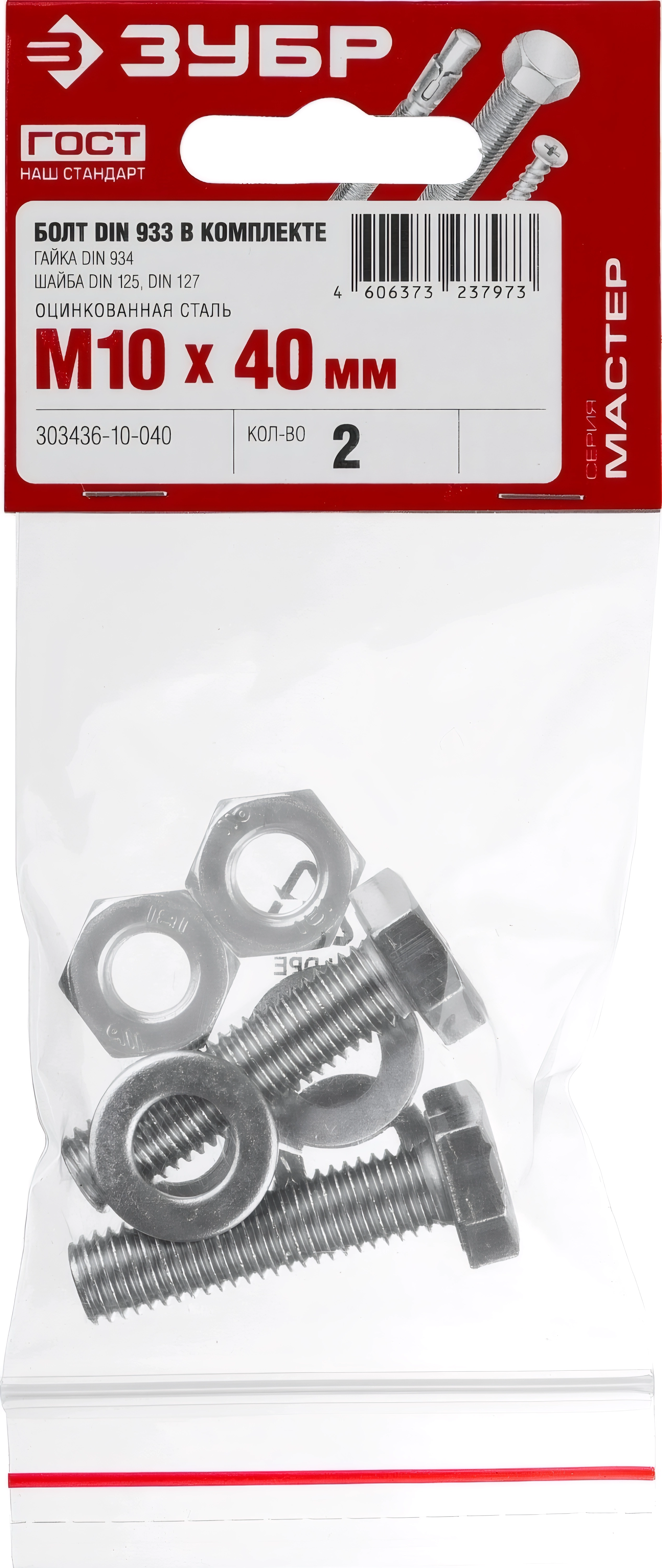 Болт с гайкой и шайбами ЗУБР DIN 933, M10 х 40 мм, цинк, 2 шт