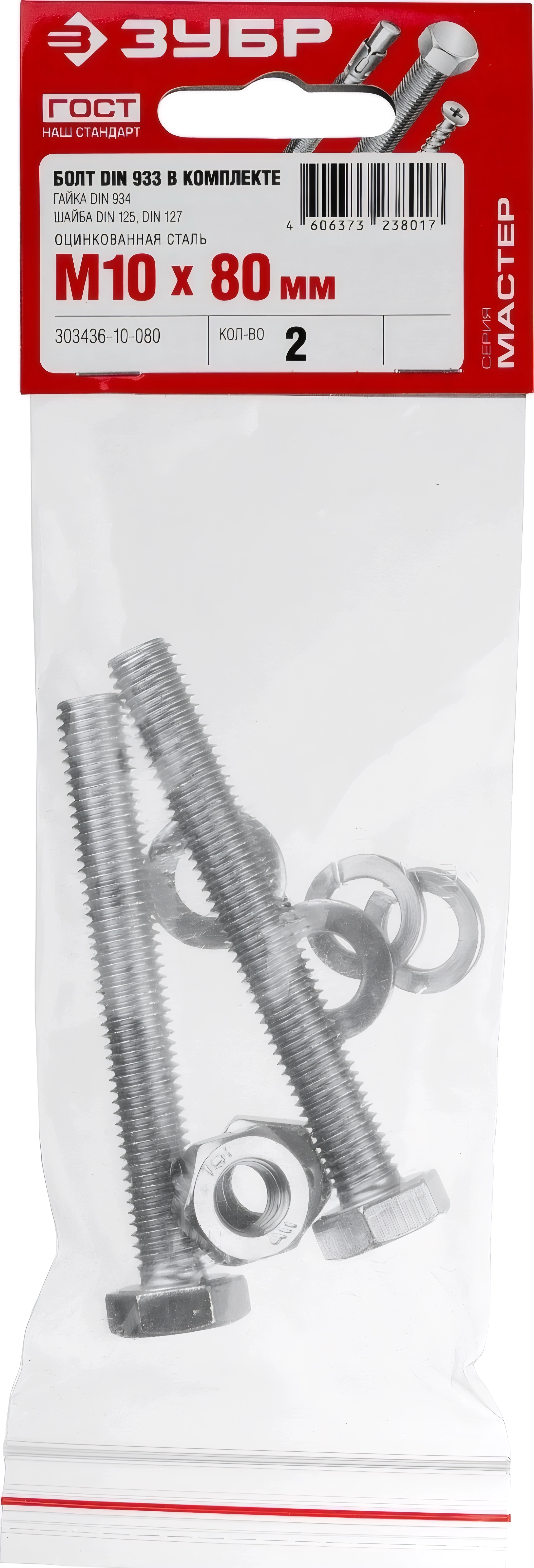 Болт с гайкой и шайбами ЗУБР DIN 933, M10 х 80 мм, цинк, 2 шт